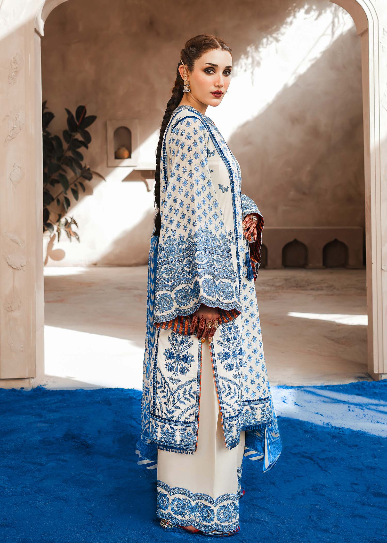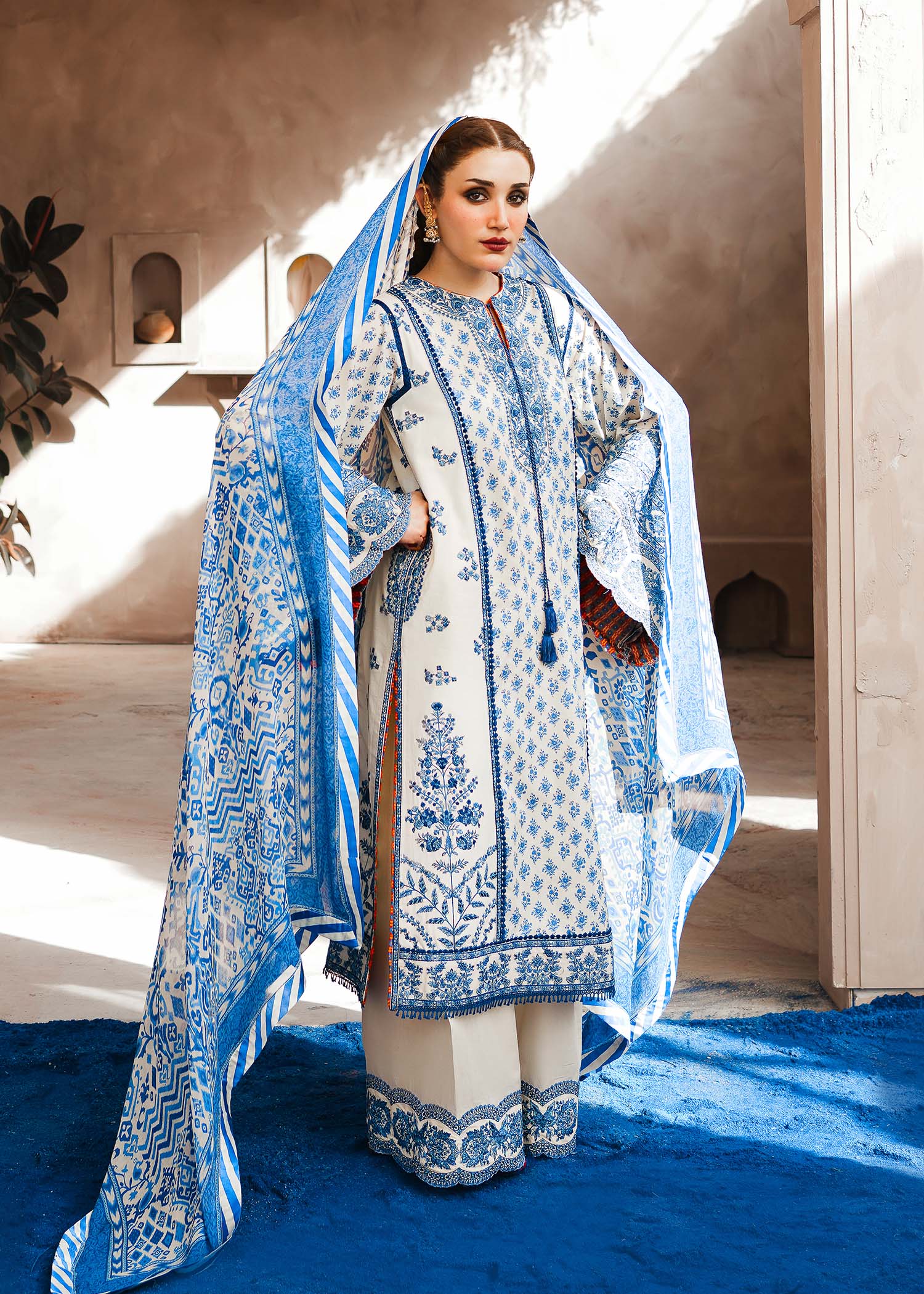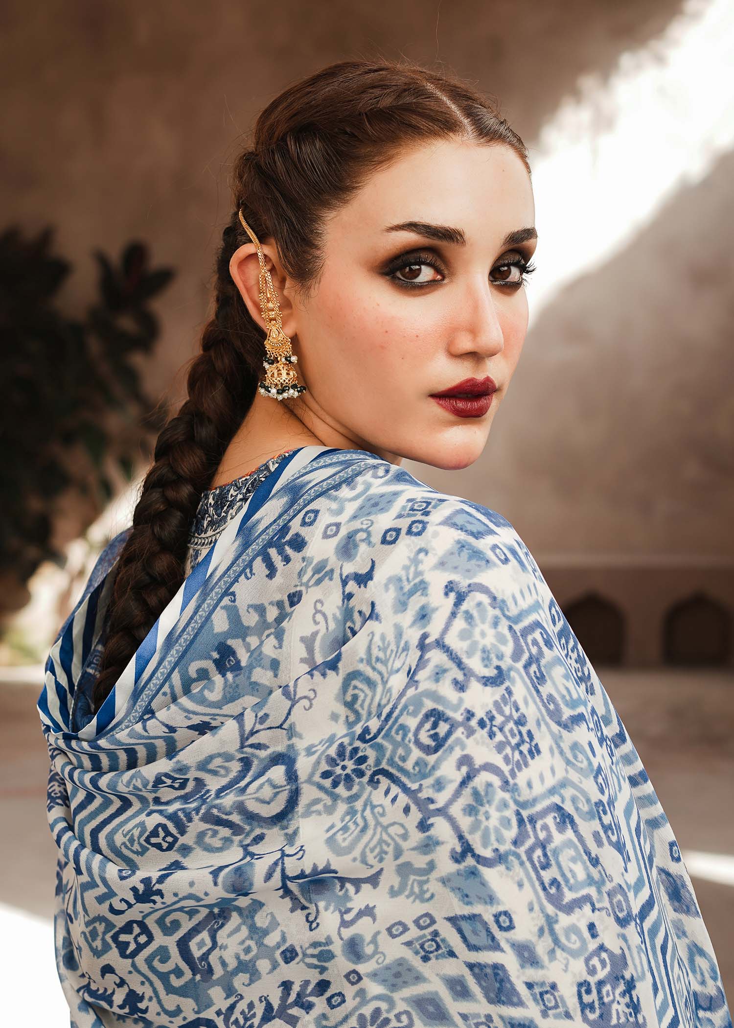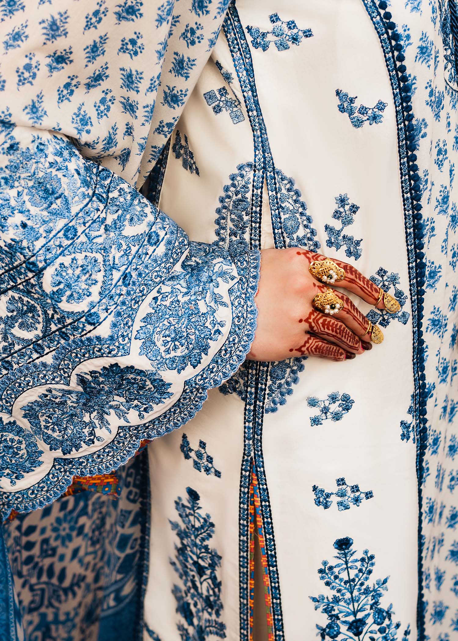 This gorgeous piece is an eye candy perfect for this summer heat, cool shades of blue embroidery and print enhancing the ivory base. A gorgeous scallop border adorning shalwar hem with printed traditional ikkat print makes it perfect stunner for this eid.