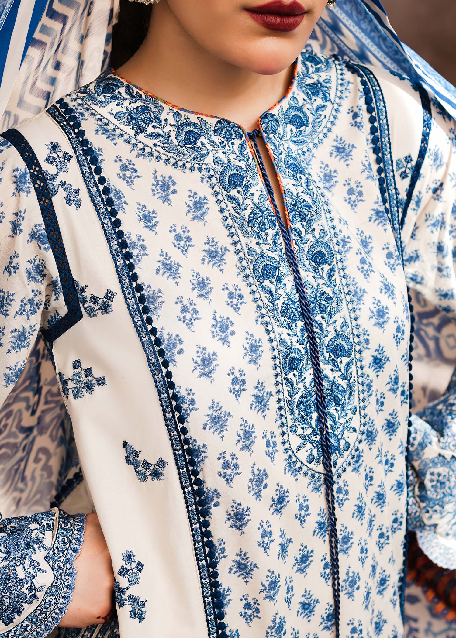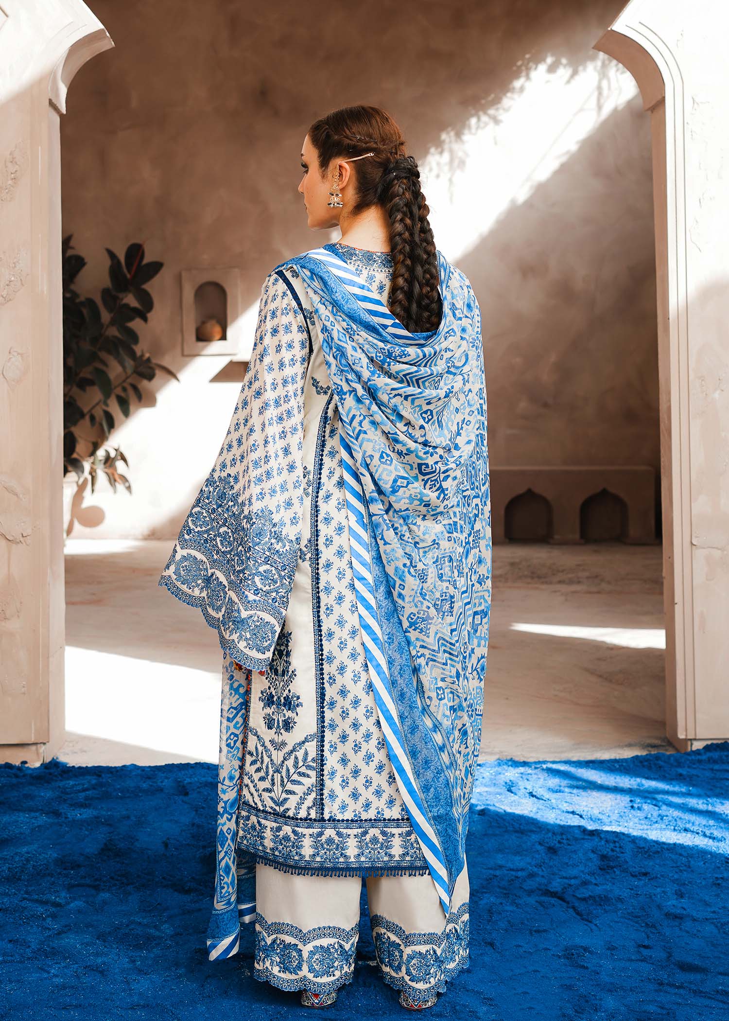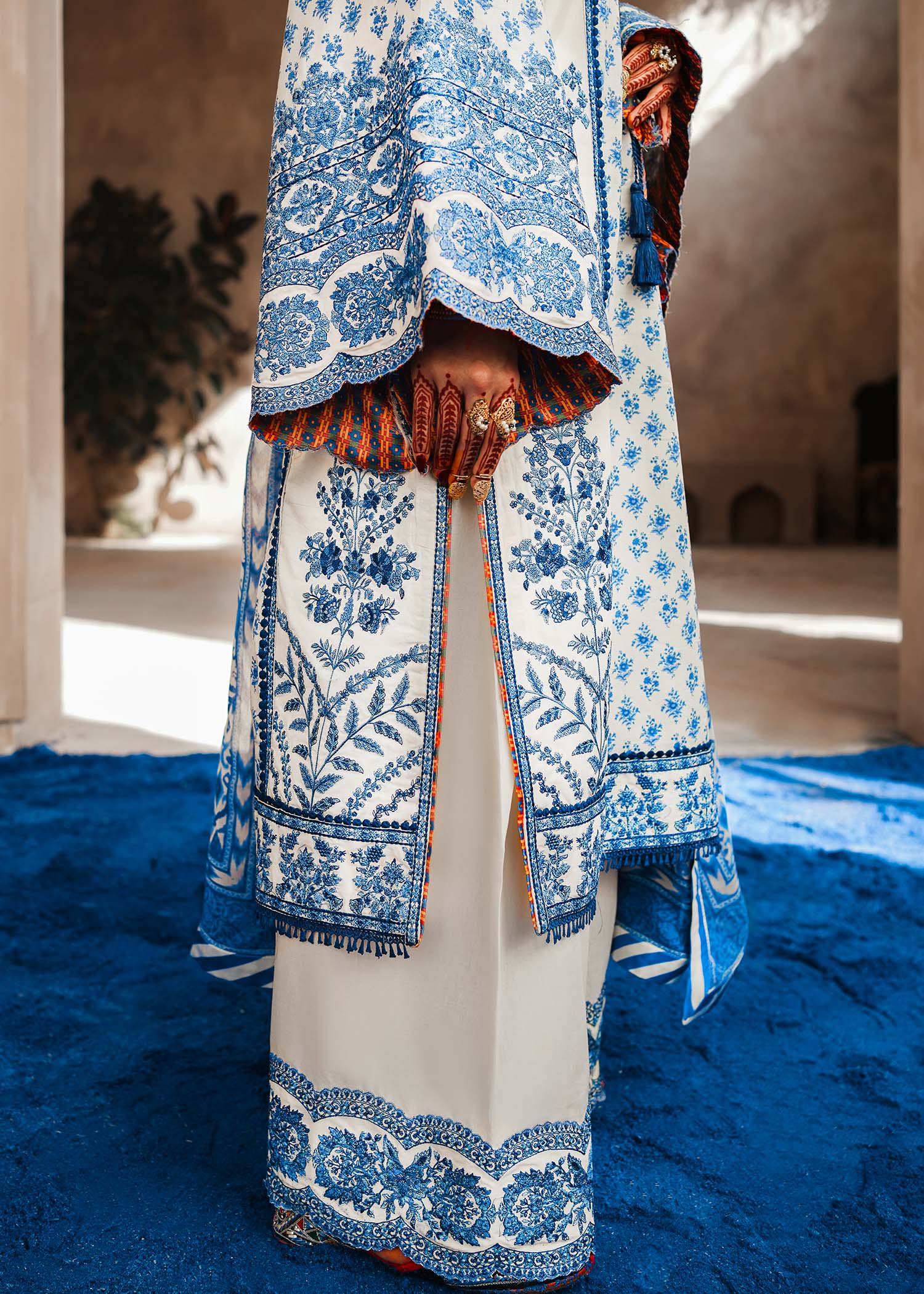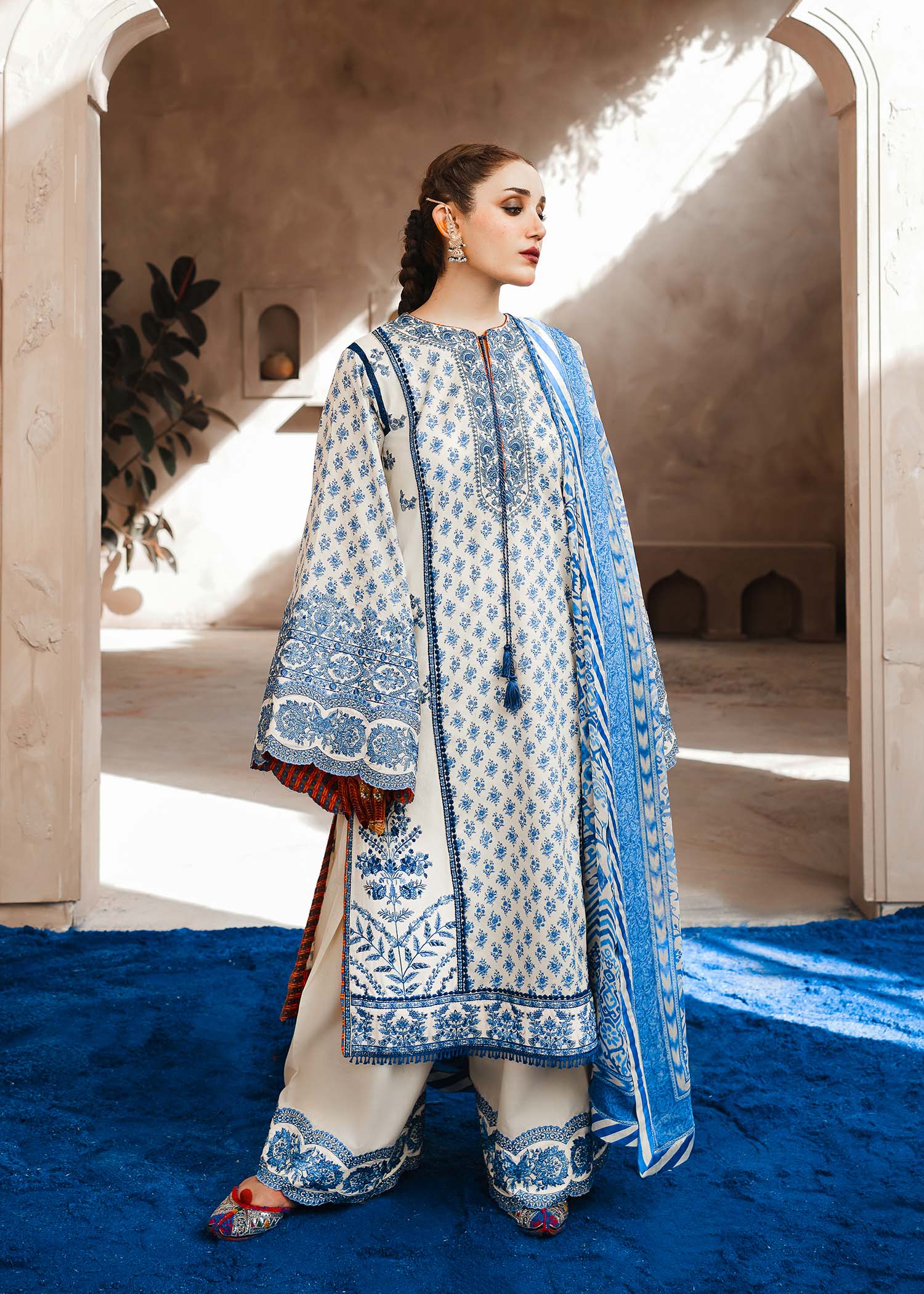 This gorgeous piece is an eye candy perfect for this summer heat, cool shades of blue embroidery and print enhancing the ivory base. A gorgeous scallop border adorning shalwar hem with printed traditional ikkat print makes it perfect stunner for this eid.