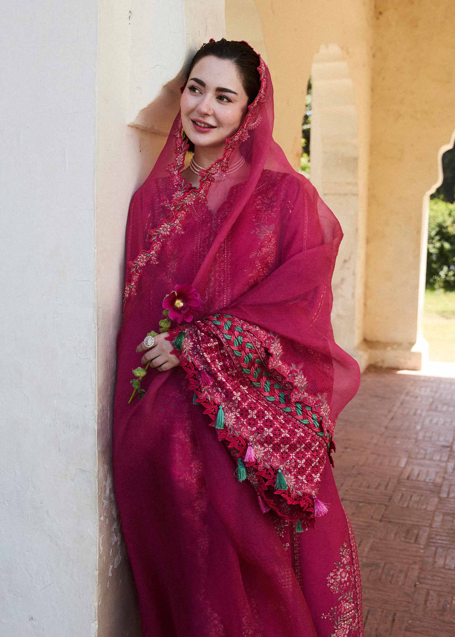 Embrace the elegance of summer season with this radish pink ensemble,adorned with intricate floral embroidery.Paired with a light pink shalwar featuring matching floral motifs,and a sublime organza dupatta,it's a timeless ode to floral beauty.