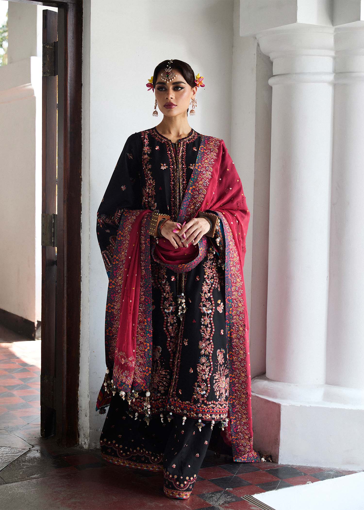 Embrace the elegance of summer season with this Black with intricate floral embroidery adorns the outfit, creating a timeless and elegant look with black trousers with an embroidered border adds a touch of sophistication. A beautifully embroidered chiffon dupatta in red with the same pattern as the outfit adds a romantic touch. The lightweight, breathable fabric and elegant design make this outfit perfect for summer evenings.