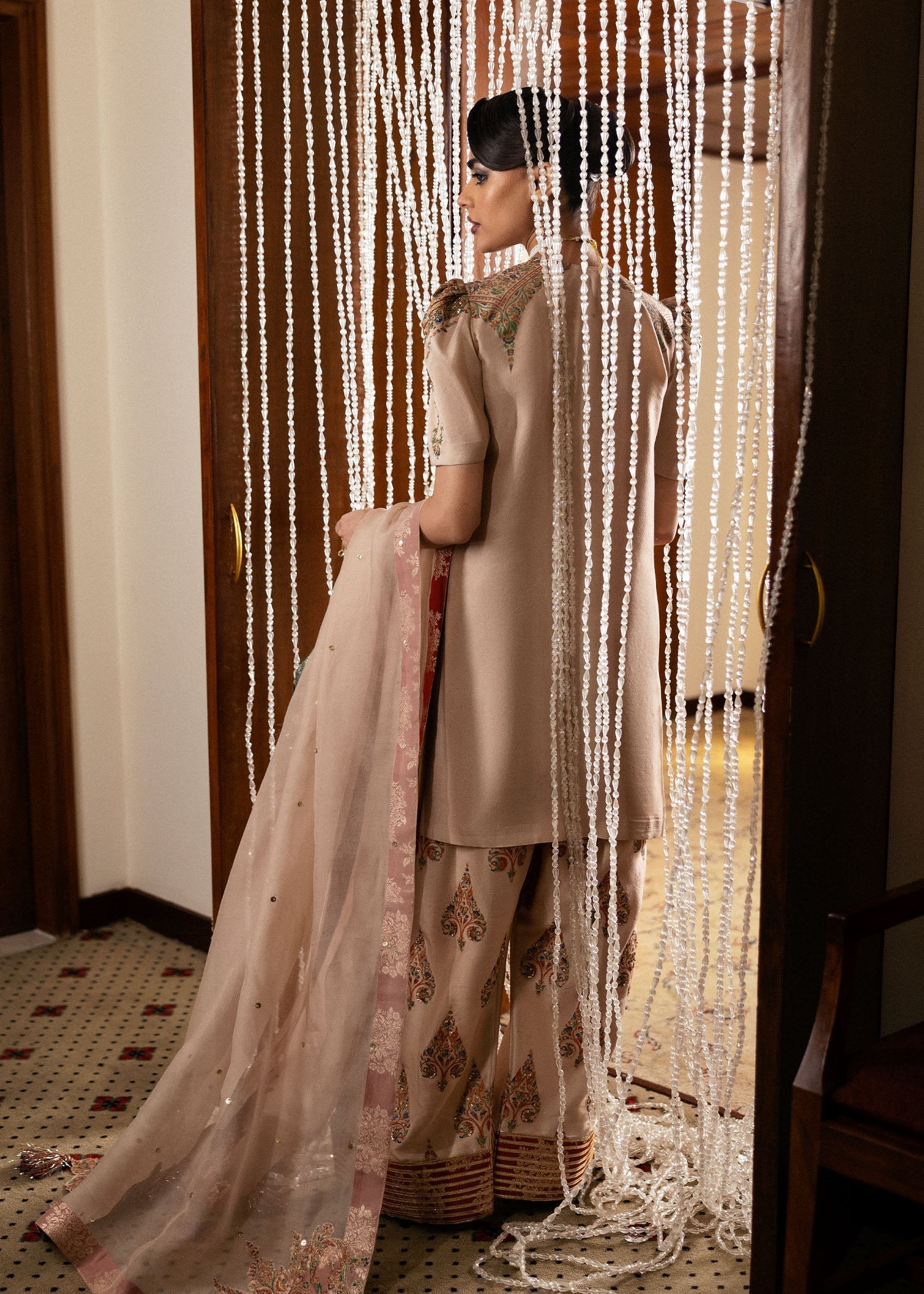 Embrace timeless elegance with this exquisite beige raw silk shirt, featuring intricate screen printing and delicate embellishments that elevate its charm. The puff sleeves are beautifully adorned, adding a touch of sophistication and femininity to the overall design. The neckline is accentuated with stylish loop buttons, enhancing the shirt’s refined aesthetic.Complemented by a beige embellished screen-printed shalwar, the chanderi silk poncha with gotta details adds a distinctive and stylish contrast, creating a perfect fusion of traditional and contemporary style in this ensemble. Completing the look is a stunning beige organza dupatta, featuring cutworked corner motifs that add a graceful touch. This versatile outfit is ideal for festive occasions, family gatherings, or any special event, ensuring you make a lasting impression with every wear. Elevate your wardrobe with this beautiful combination that celebrates elegance and craftsmanship.