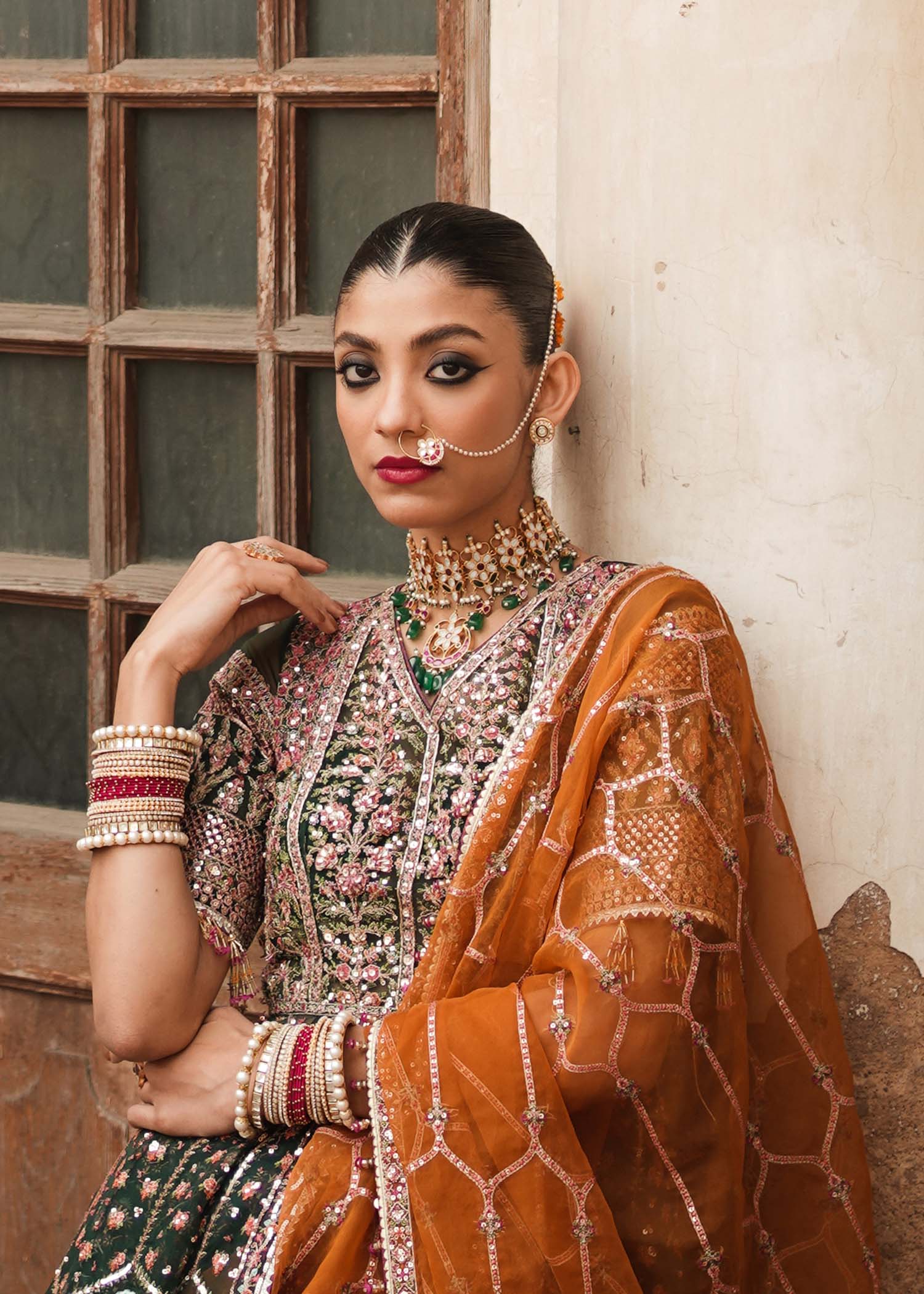 Fasana – this green pishwas is donned with floral motifs and bunches in hues of pink, purple, coral and green threads, along with gold sequin and tilla work. Layered with pearls, naqshi and pipes. Paired with complementing organza dupatta and screen printed Indian raw silk sharara.