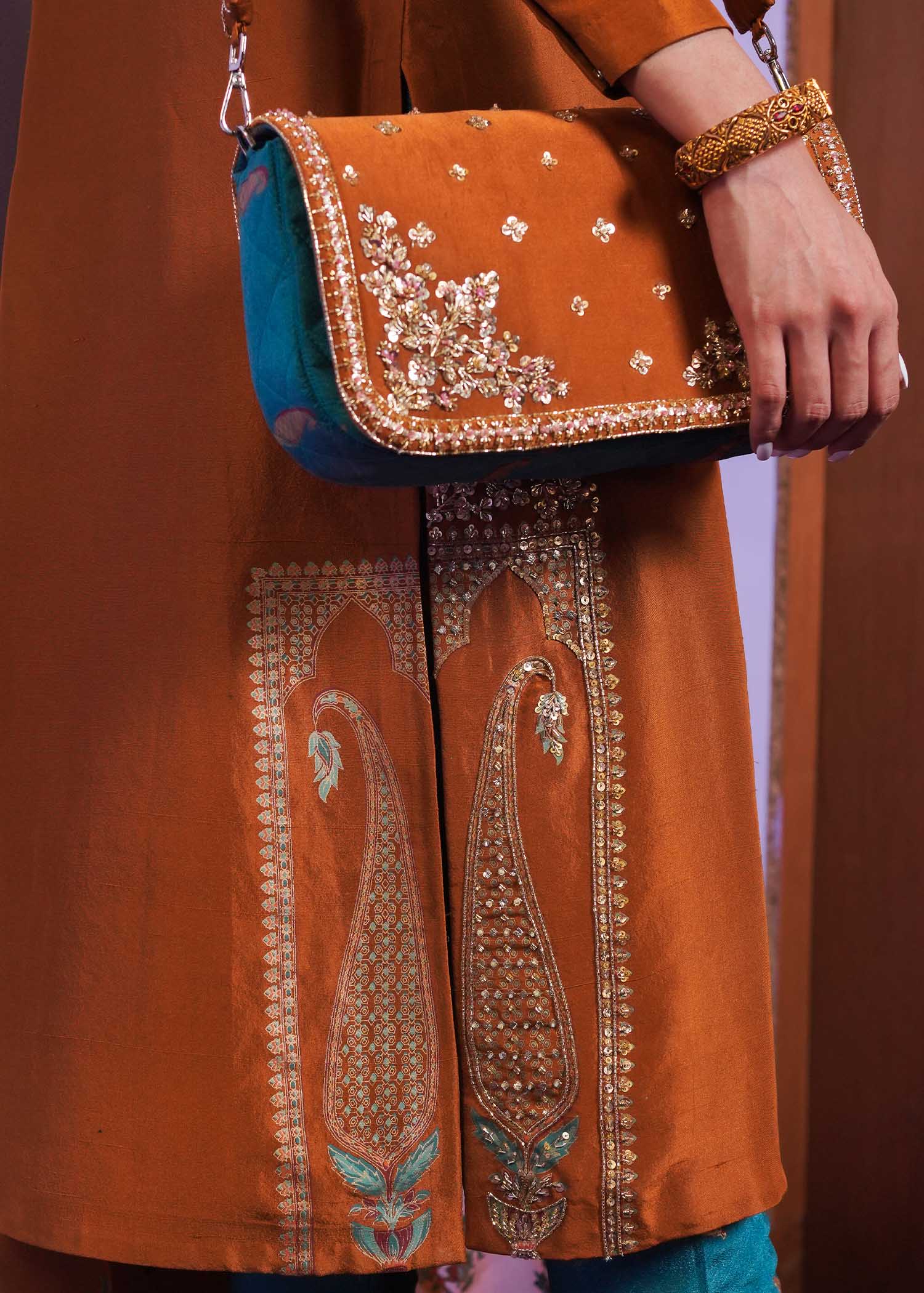 An alluring brown outfit adorned with an appealing neckline and side motifs which has gold sequin, naqshi and pink, zinc and gold buggle beads and a printed teal colored chooridaar. The ornate design creates a mesmerizing effect.