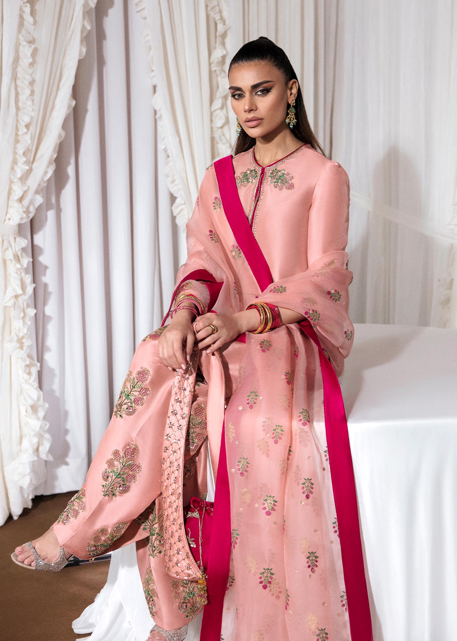 It comes with a block-printed raw silk shalwar and embellished on the printed motifs similarly, it also comes with a block-printed organza dupatta with is sprayed all over with gold sequins with shocking pink satin silk border on all four sides.