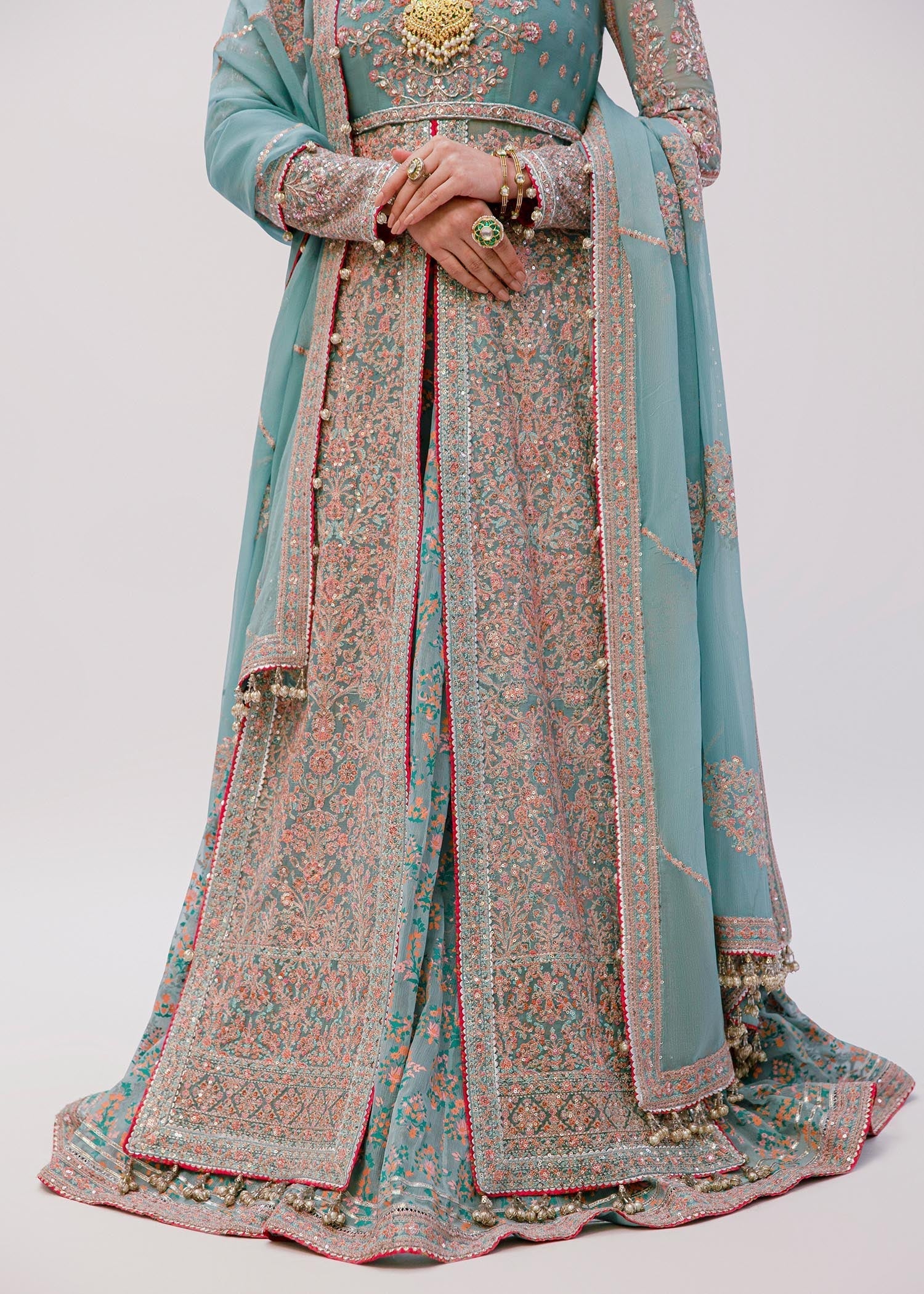Khuaab – this ice blue chiffon jacket is decked with floral neckline and intricate jaal in hues of blue and pink embroidery, layered with silver tilla and sequins along with pearls, pipes and gota work. Paired up with screen printed chiffon sharara and embroidered chiffon dupatta.