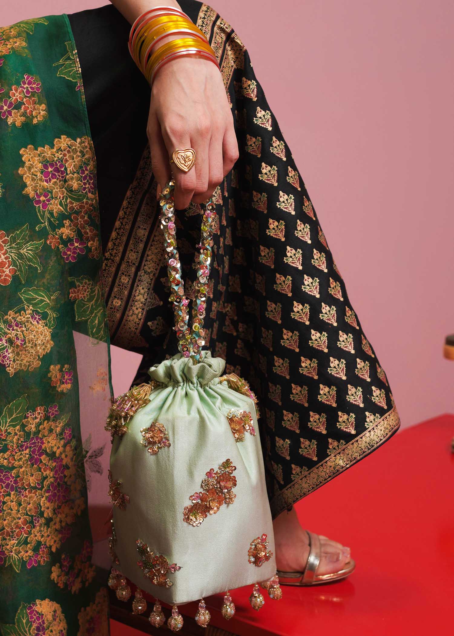 A charismatic mango yellow raw silk shirt with beautifully embellished front including details of gold nakshi, sequins, and ice blue, orange and pink buggle beads along with tassels descending down on the shirt. It is paired with a pretty printed palazzo pants and printed organza dupatta . Complete the look with signature Hussain Rehar potli that is heavily embellished.