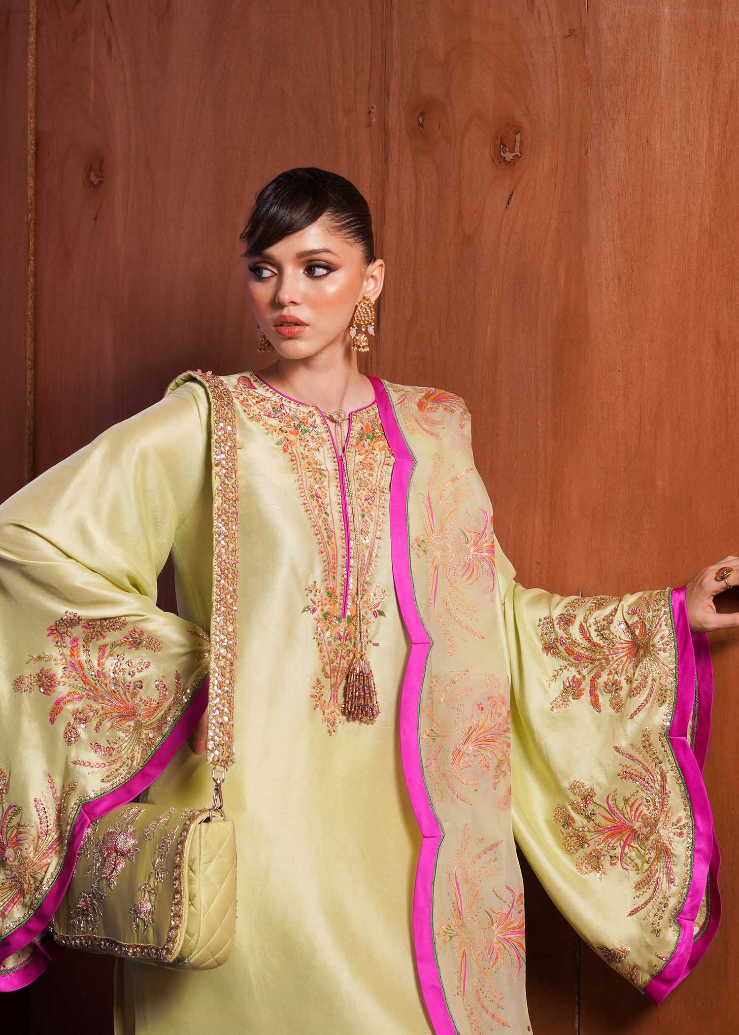 This apple green outfit glows like a rare gem with its intricate gold sequin and naqshi work. The pop of pink and green and gold buggle beads adds a whimsical touch. The scalloped sleeves and stunning neckline embellishments to take center stage.