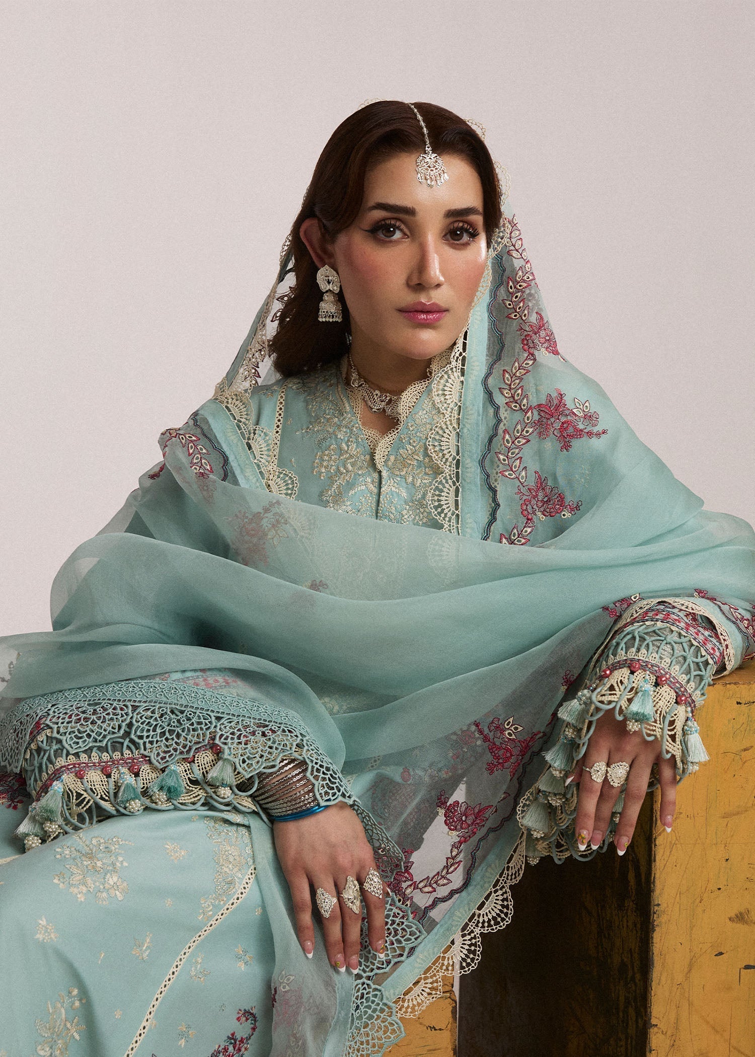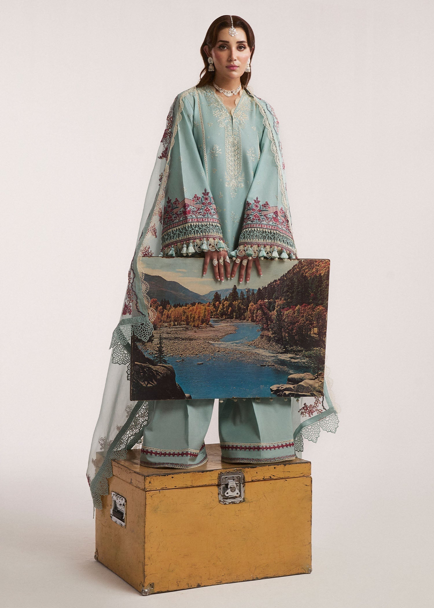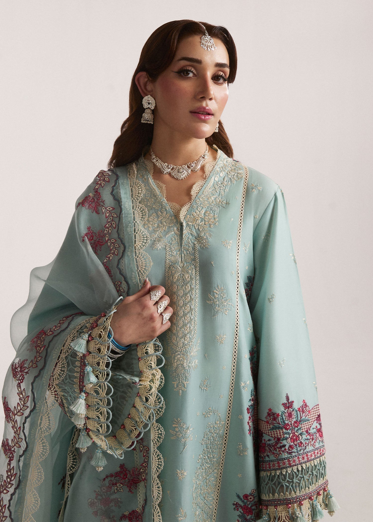 This sophisticated Aqua outfit is your go-to look for summers. The shirt is composed intricate white embroidered centre panel and multi colored side panels with same multi color centre back panel and sleeves ,paired with same color trousers. Completing this monochromatic look with same embroidered organza dupatta.