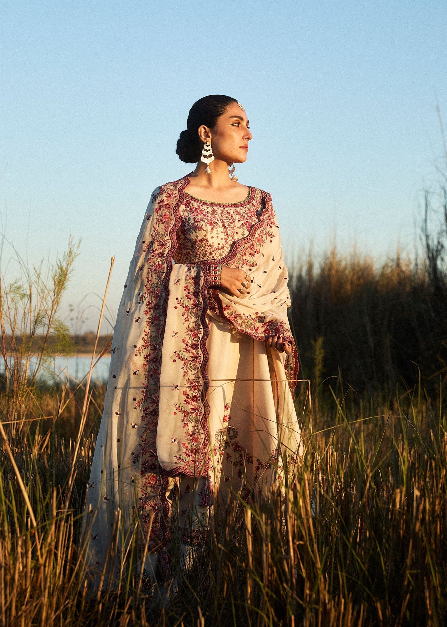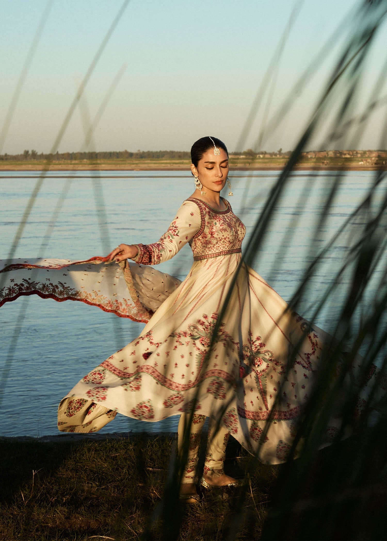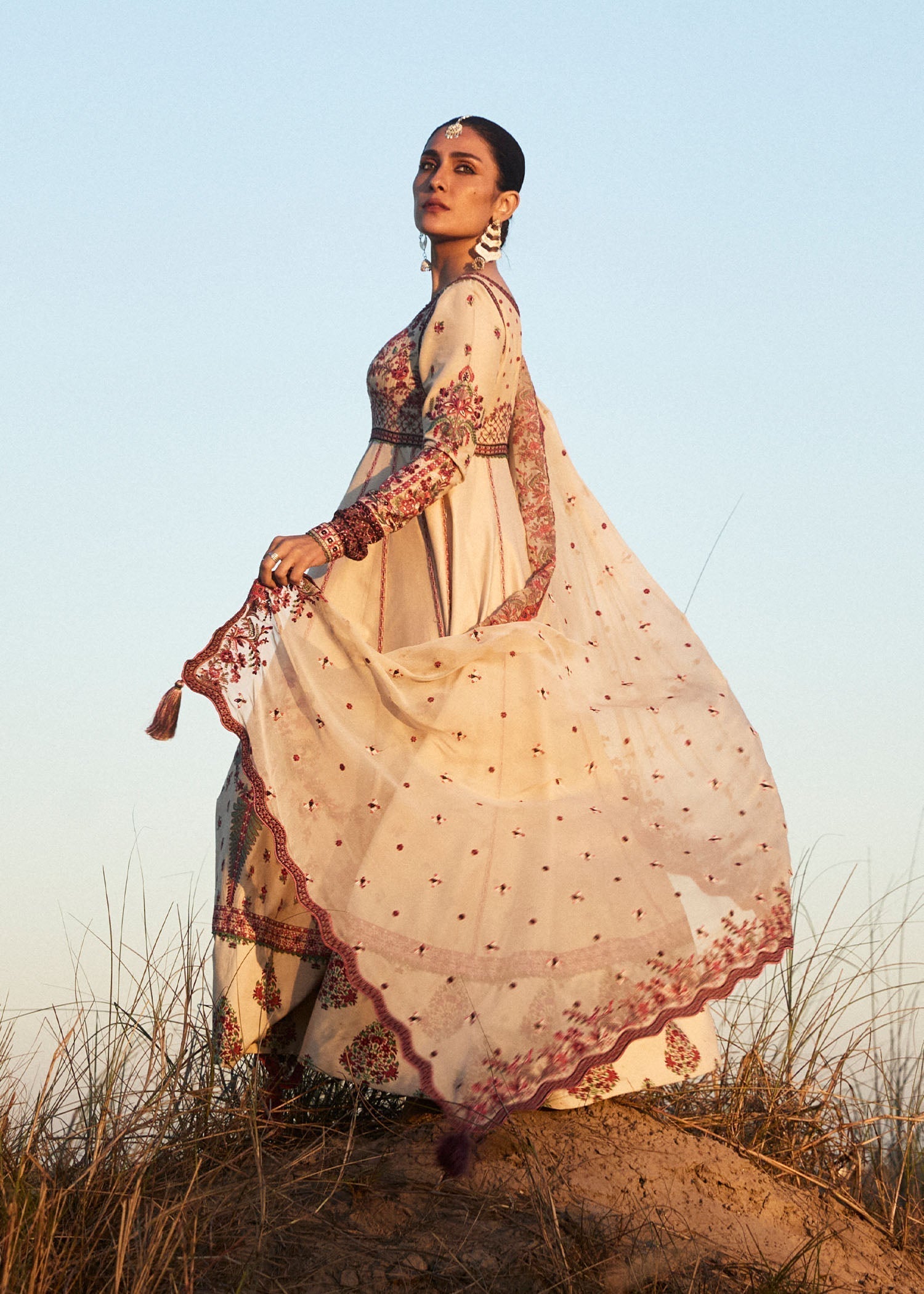This outfit is a traditional long dress peshwas with intricate embroidery on a beige color lawn. It features floral and geometric patterns in red and green, with detailed embroidery on the bodice, sleeves, and hemline. The dress has mixture of embroidery and Digital print creating a graceful silhouette. The outfit is paired with a chiffon embroidered dupatta, adorned with small floral motifs and a decorative border with tassels, enhancing its elegance.