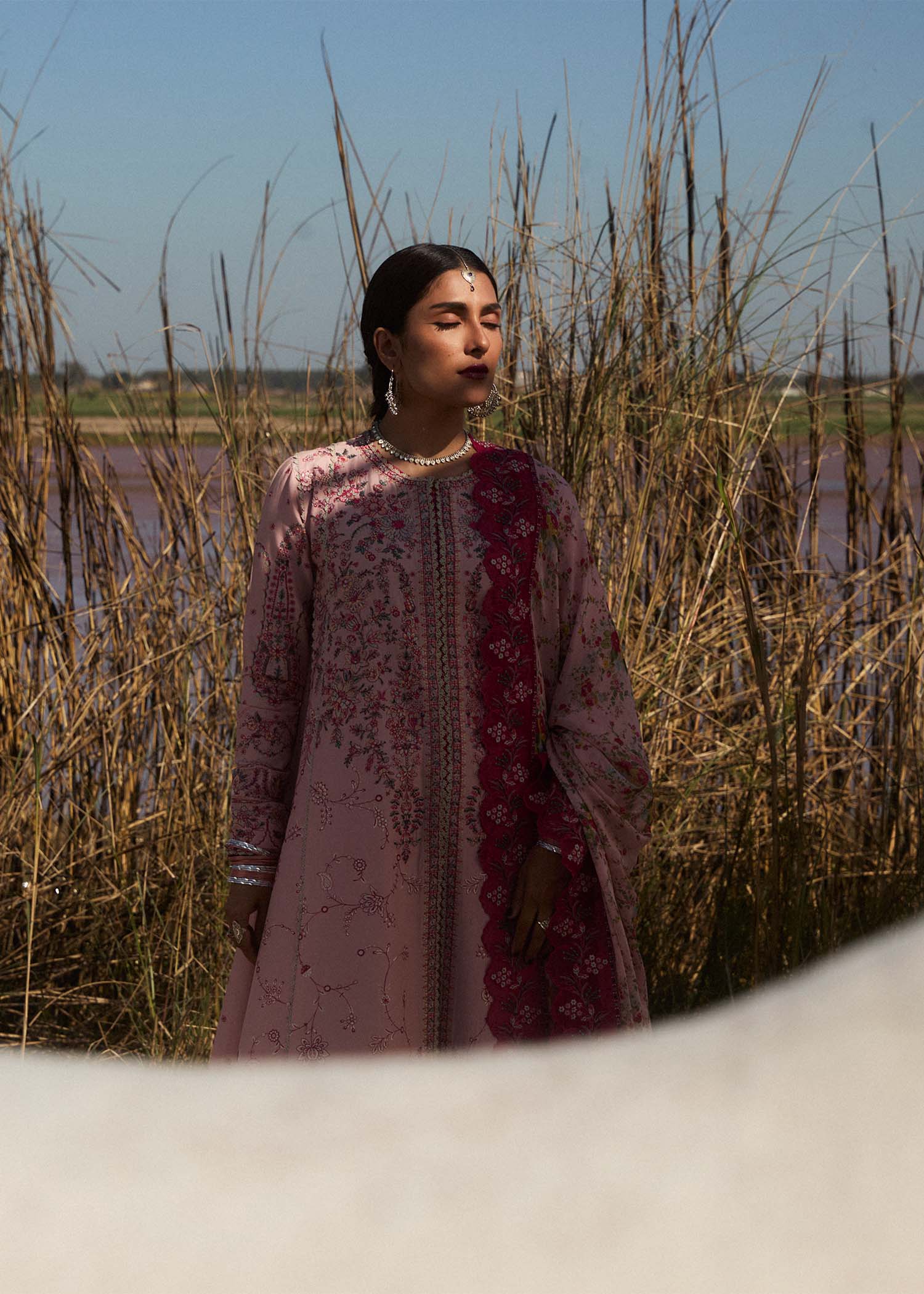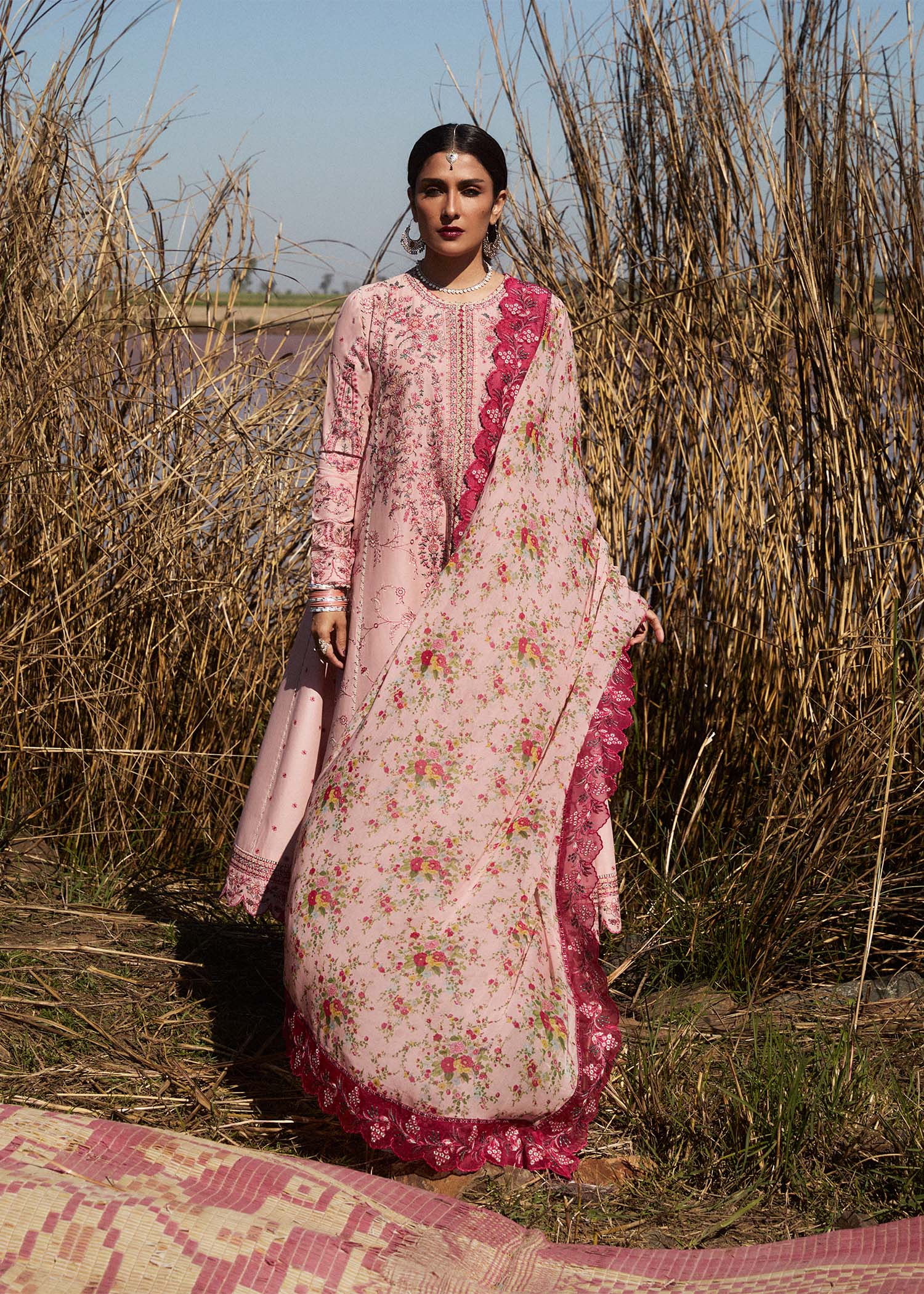 This is a stunning, embroidered lawn outfit in a soft pastel pink shade. The outfit features intricate floral embroidery in shades of maroon and pink, beautifully adorning the bodice, sleeves, and lower hemline. The embroidery is delicately detailed with fine threadwork an adding a touch of elegance. The long, flared silhouette of the dress gives it a graceful and flowy look, making it perfect for formal occasions. The sleeves are adorned with embroidered cuffs, enhancing the regal appeal. The ensemble is paired with matching trousers, printed chiffon dupatta also have a subtle embroidered organza border for a cohesive and sophisticated finish. This outfit is a perfect blend of traditional craftsmanship and modern elegance, ideal for festive events, weddings, or evening gatherings.