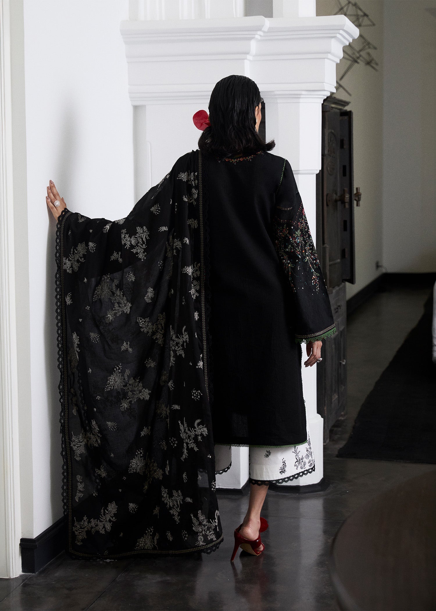 Make a bold statement this summer with this jet black jacquard outfit, crafted from breathable fabric for all-day comfort. The star of the look—its intricately designed sleeves—adds a dramatic touch, finished with elegant tassels. Paired with ivory culottes featuring all-over black embroidery, and a reverse palette lawn dupatta in black with delicate ivory embroideries, this outfit is the definition of modern elegance.