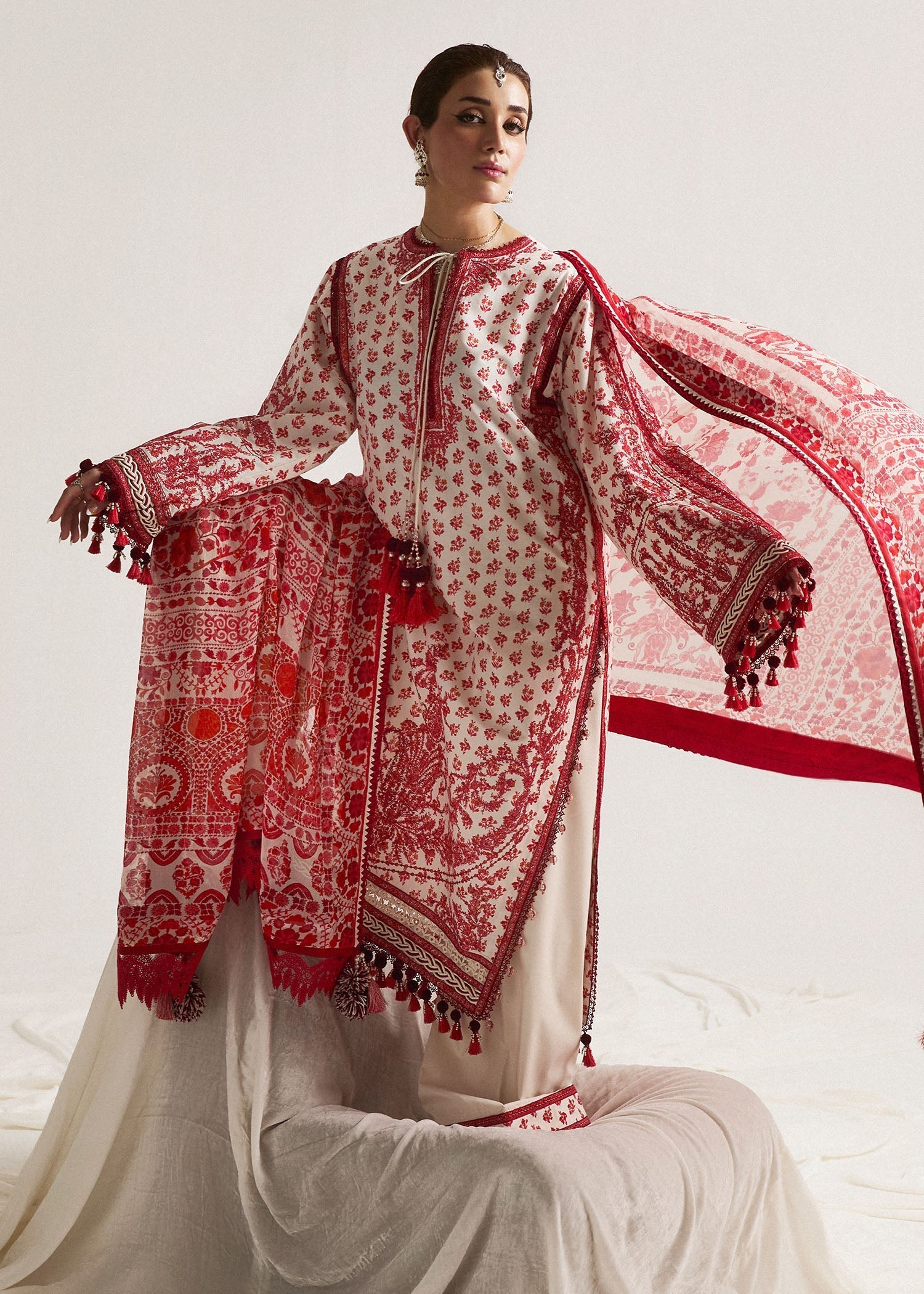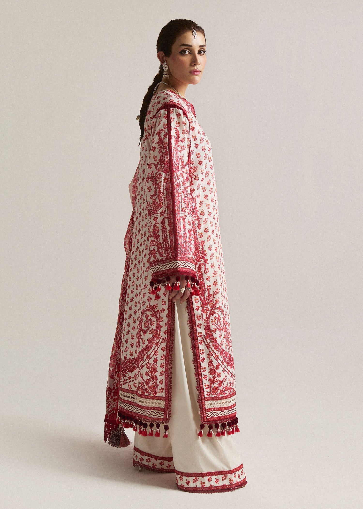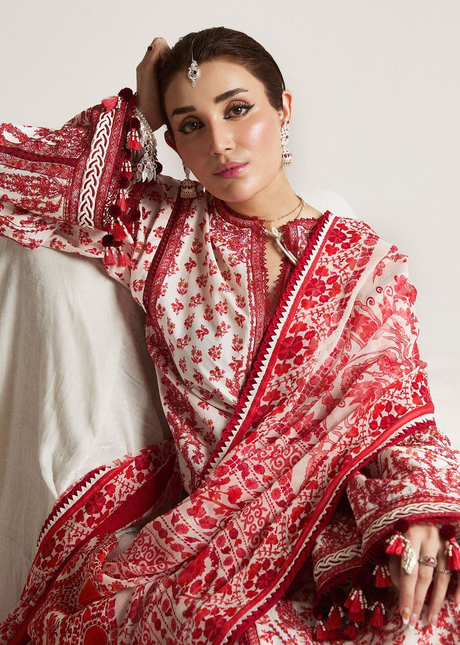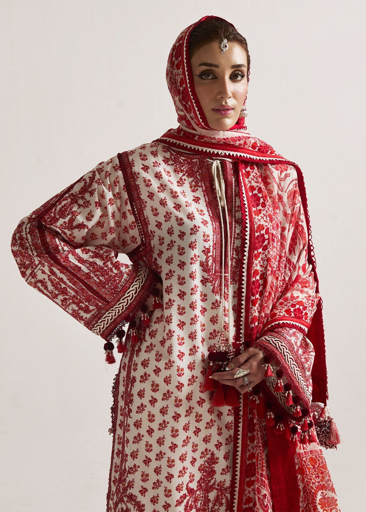 This ivory ensembles takes its inspiration from the Kashmiri Floral art. Delicate florals convoluted with repeat Floral patterns makes this labyrinth even more appealing. Regal red tones mixing with orange hues and highlighted with the maroon outline. A dyed Shalwar with printed border makes this article looks different. Digital Chiffon Dupatta adds with the textures of contemporary vibe.