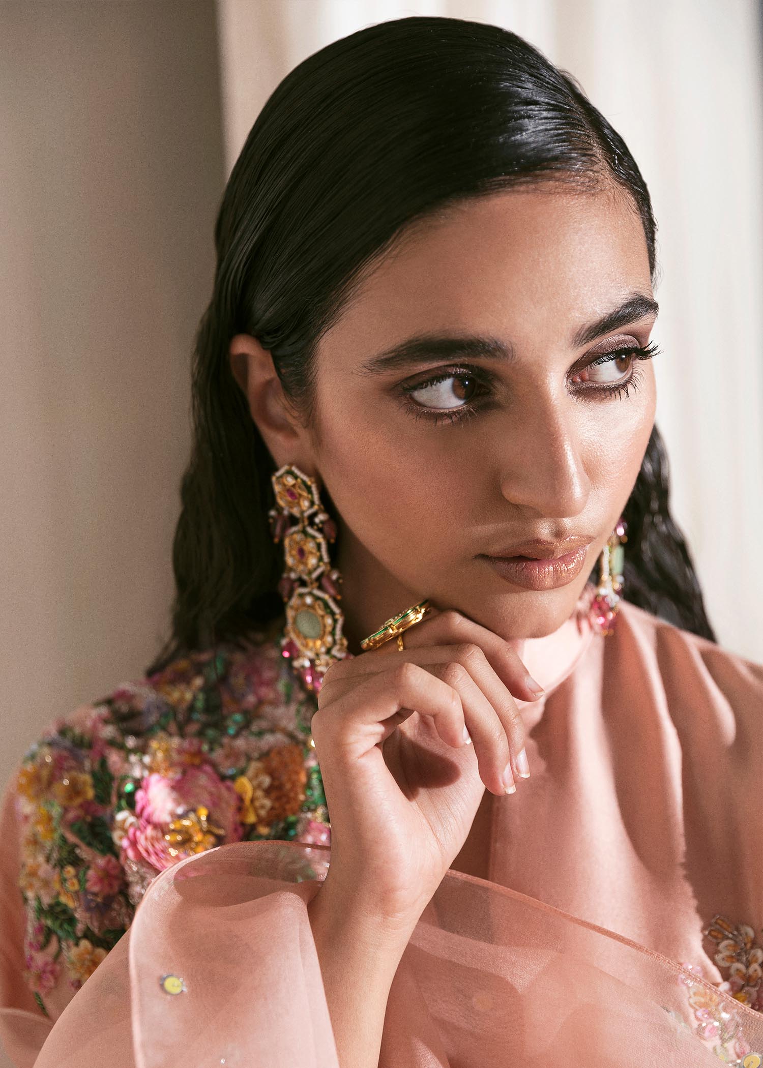 This pink raw silk set is exquisitely adorned with hand embellished floral motifs donned in pinks, greens, and yellow with hints of purple sequin adding beautiful depth. Paired with palazzo pants. Raw silk shirt: 36” Palazzo pants: 45” Organza dupatta: 2.5 yards.