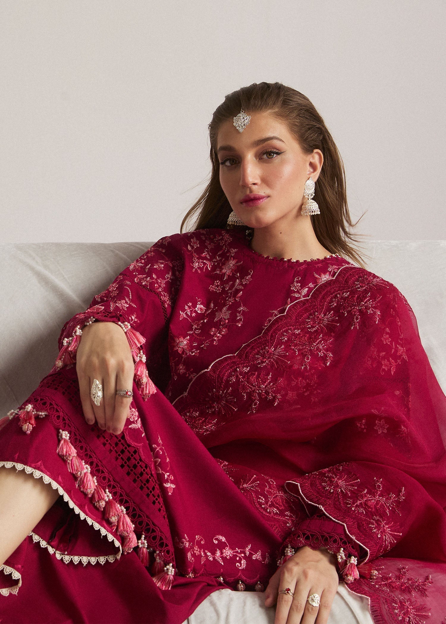 Embrace the elegance of summer season with this maroon ensemble, adorned with intricate floral embroidery. Paired with Same color dyed shalwar and a sublime organza embroidered dupatta, it's a timeless ode to floral beauty.
