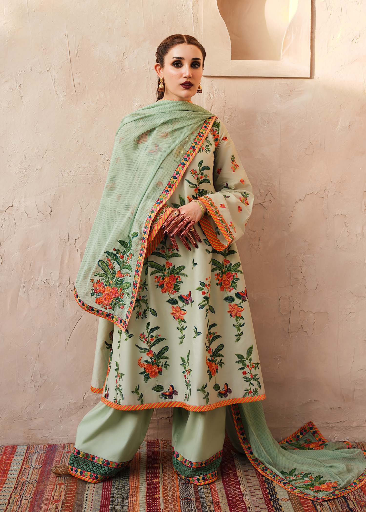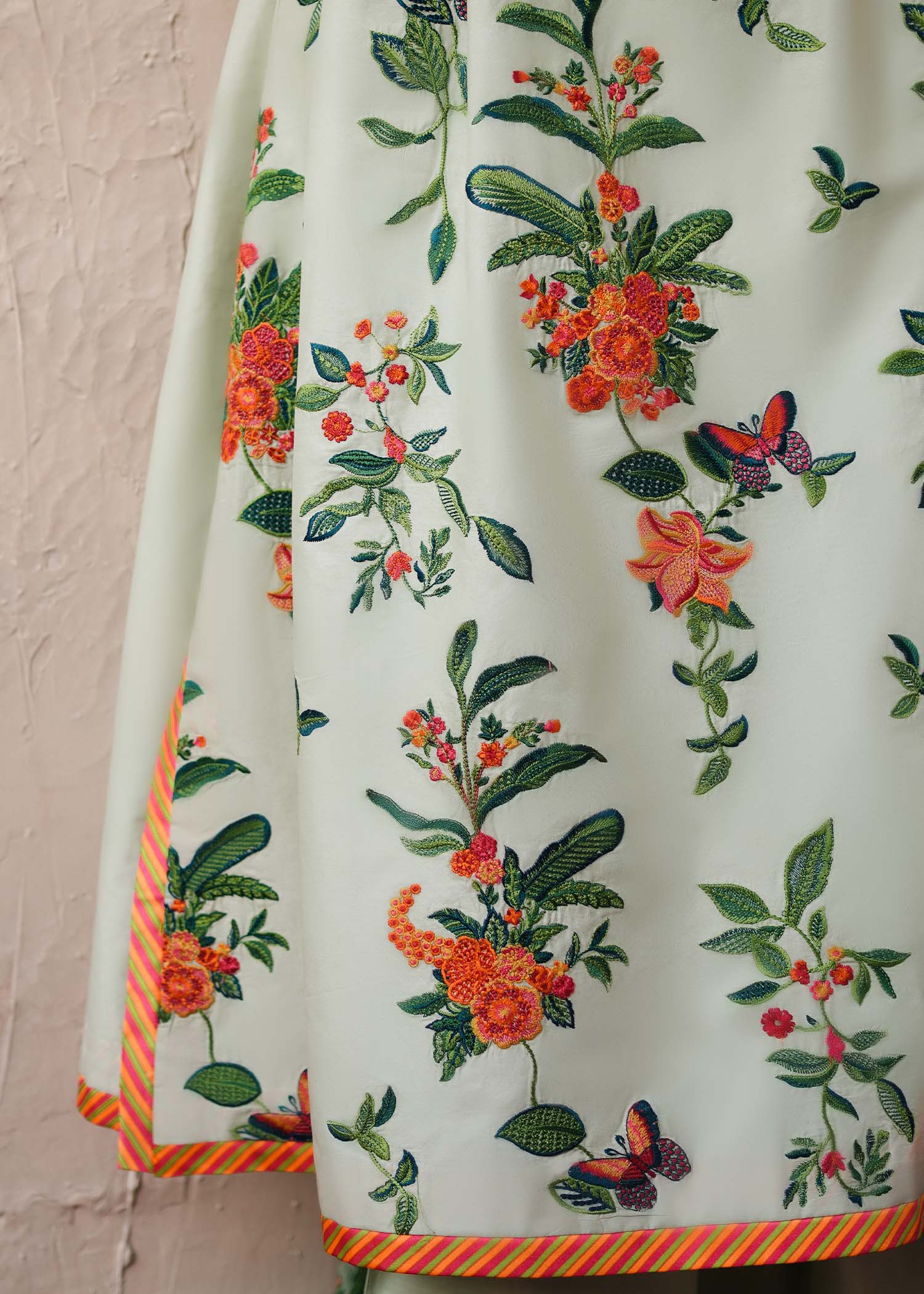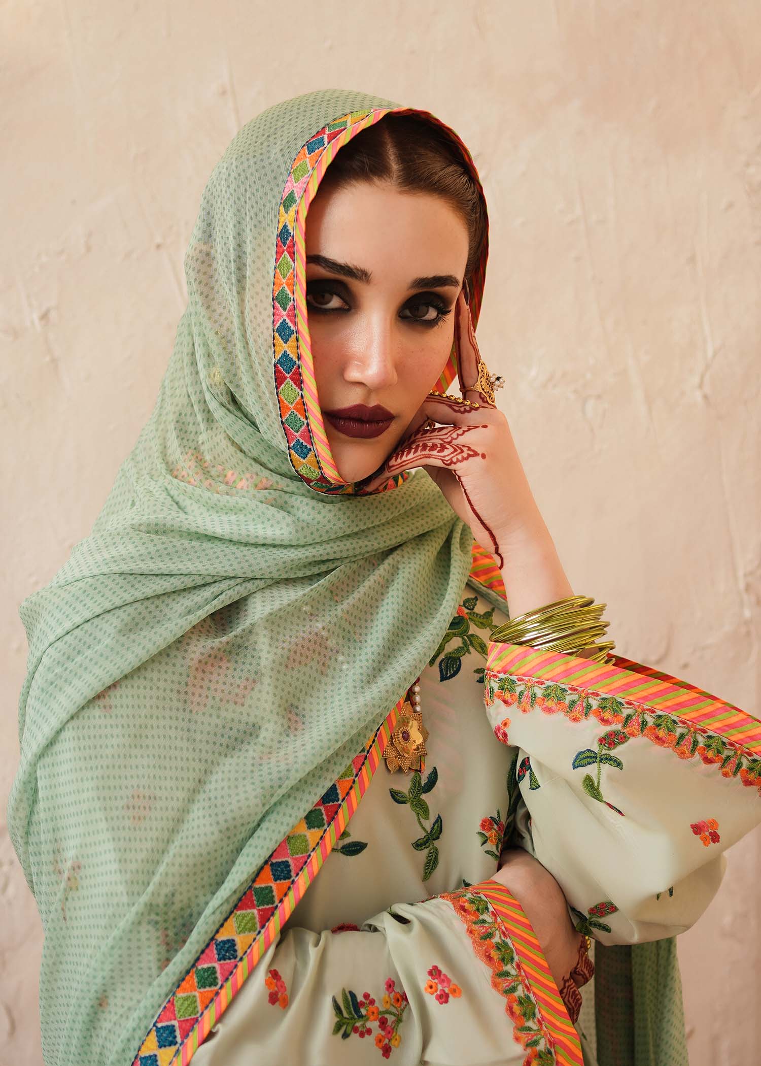 A modern-day fairytale of wild yet soft vines; adorned with elongated floral bunches enhancing this shikargah ensemble. Blended in this jungle theme are vibrant butterflies. Silhouette similar to the traditional Pashtun cultural dress paired with flapper shalwar and classic polka dots dupatta and embroidered corner motifs.