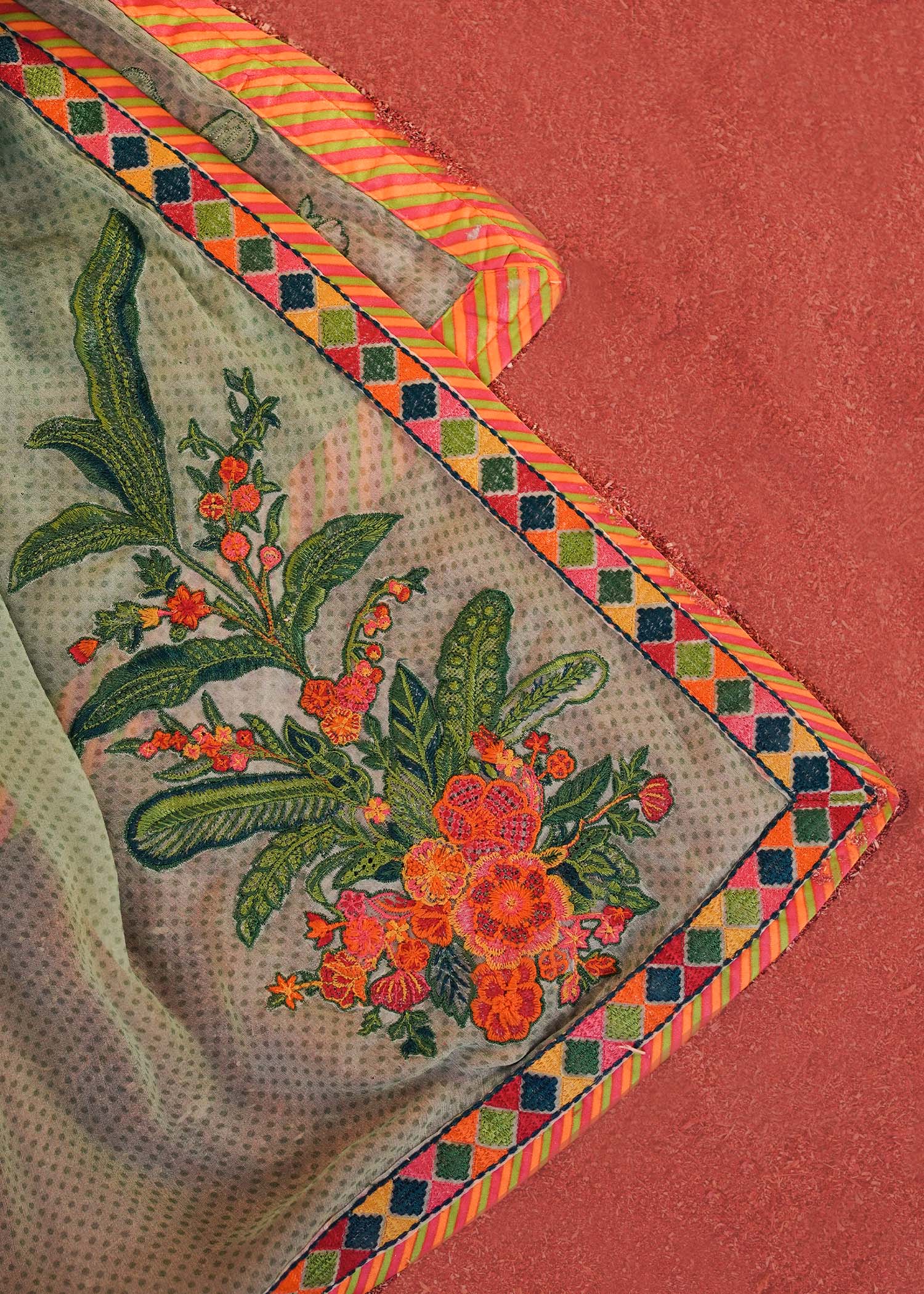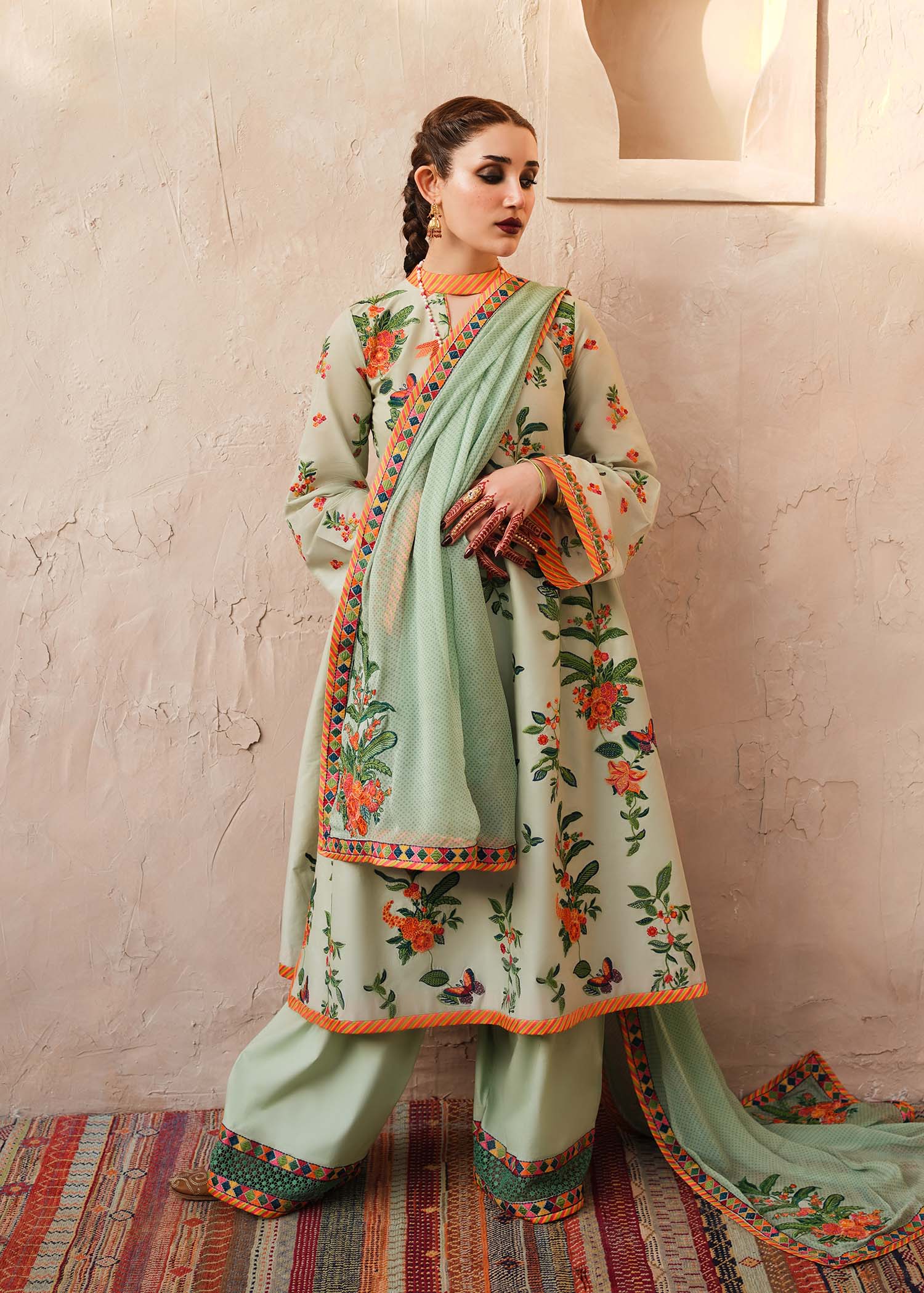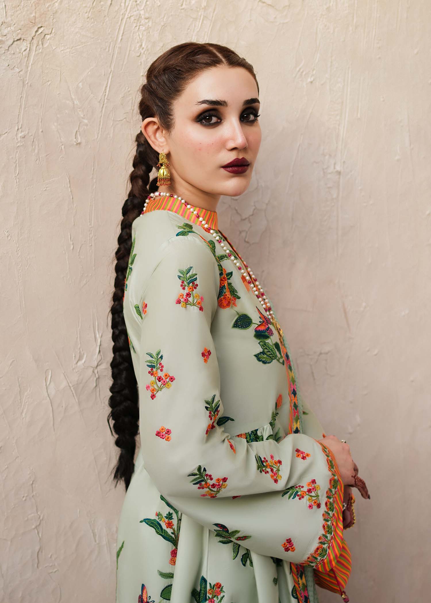 A modern-day fairytale of wild yet soft vines; adorned with elongated floral bunches enhancing this shikargah ensemble. Blended in this jungle theme are vibrant butterflies. Silhouette similar to the traditional Pashtun cultural dress paired with flapper shalwar and classic polka dots dupatta and embroidered corner motifs.
