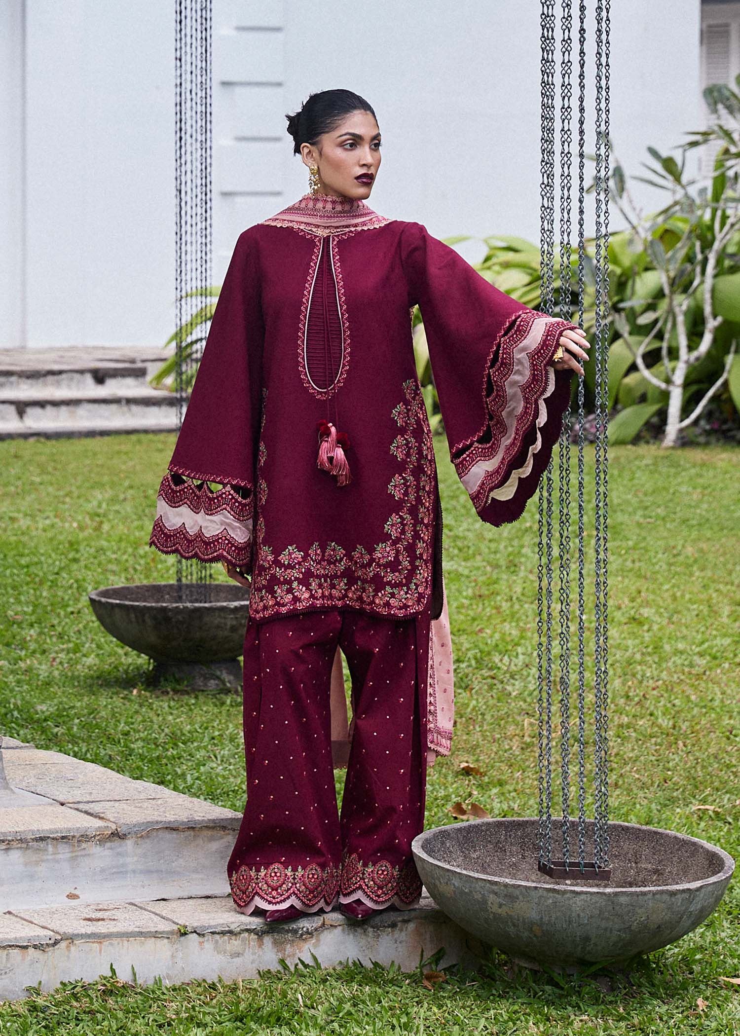 Turn up the charm in this deep maroon summer outfit, featuring a breathable short jacquard shirt with statement bell sleeves and intricate embroidery. The scalloped shalwar, finished with delicate organza detailing, adds an elegant twist. It is paired with light pink lawn embroidered dupatta. A bold, breezy look perfect for effortless day-to-evening style.