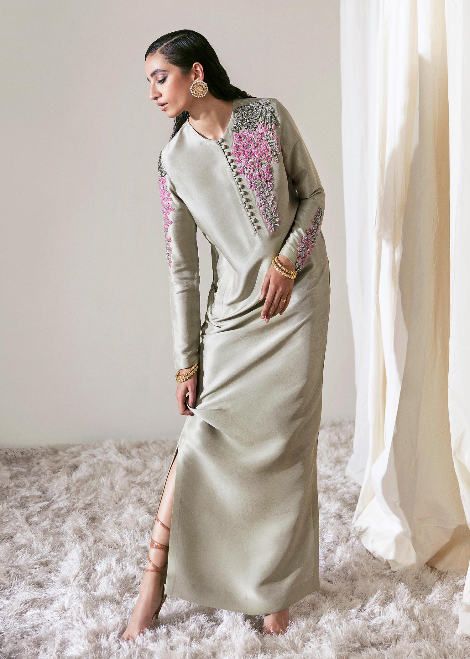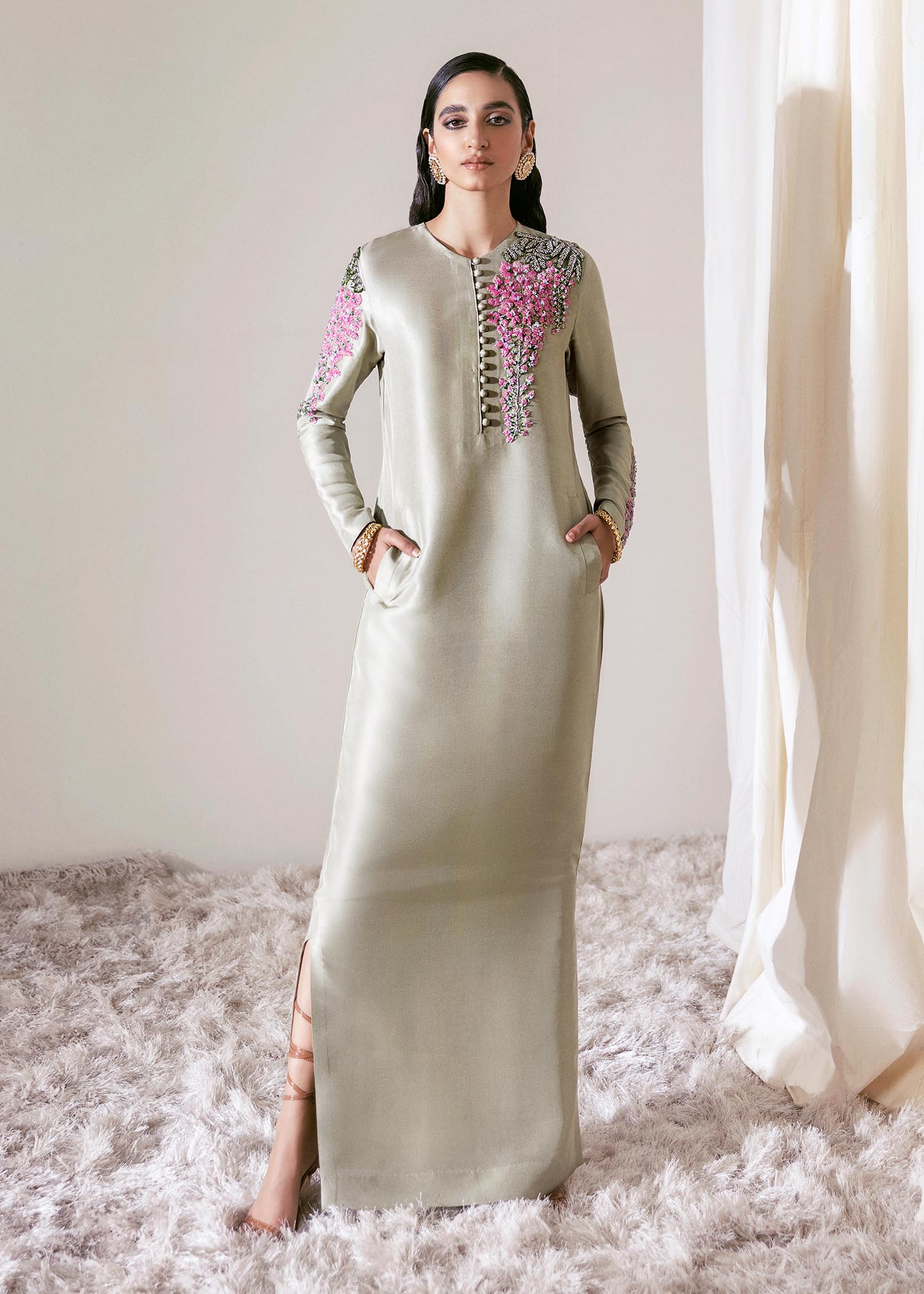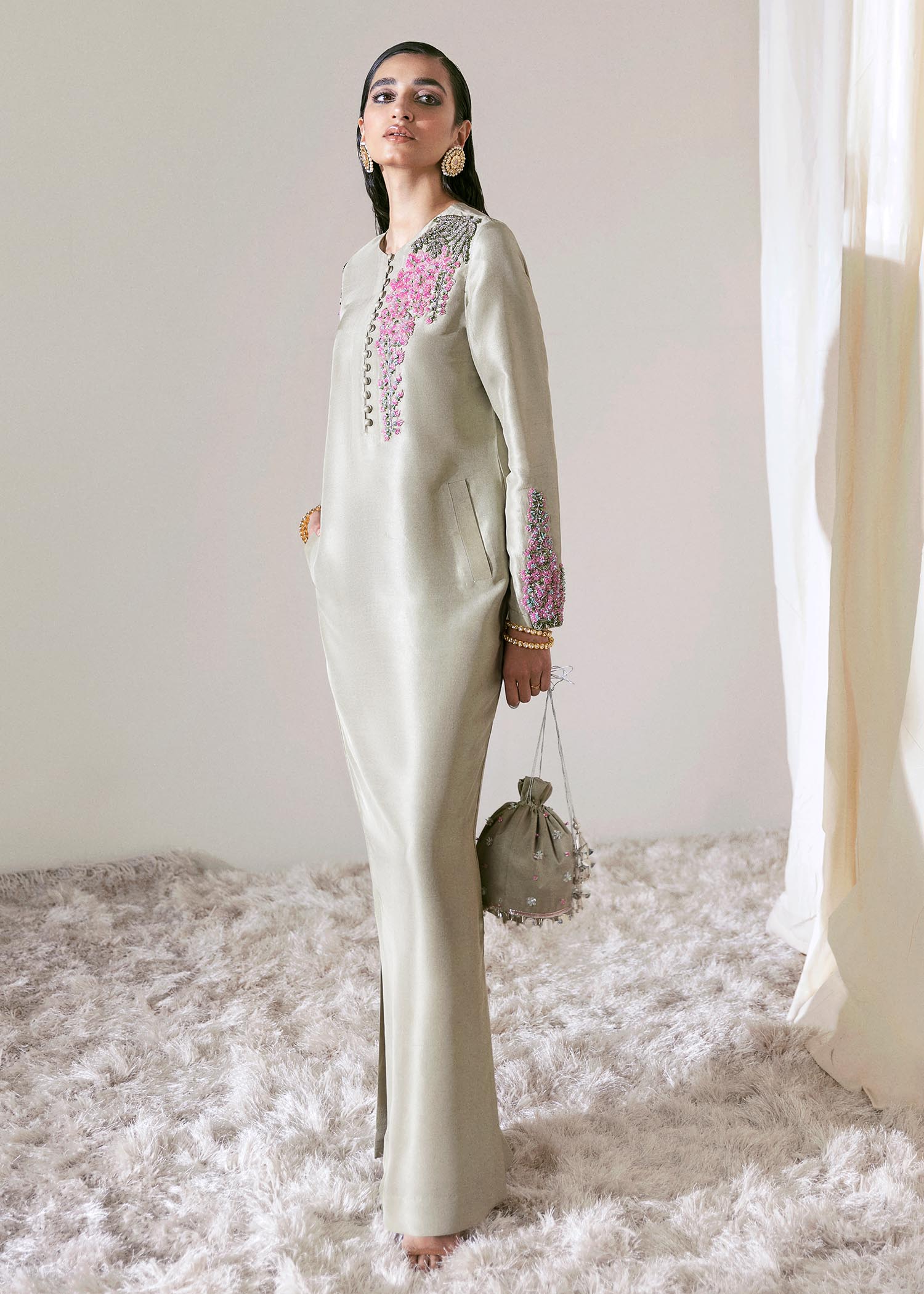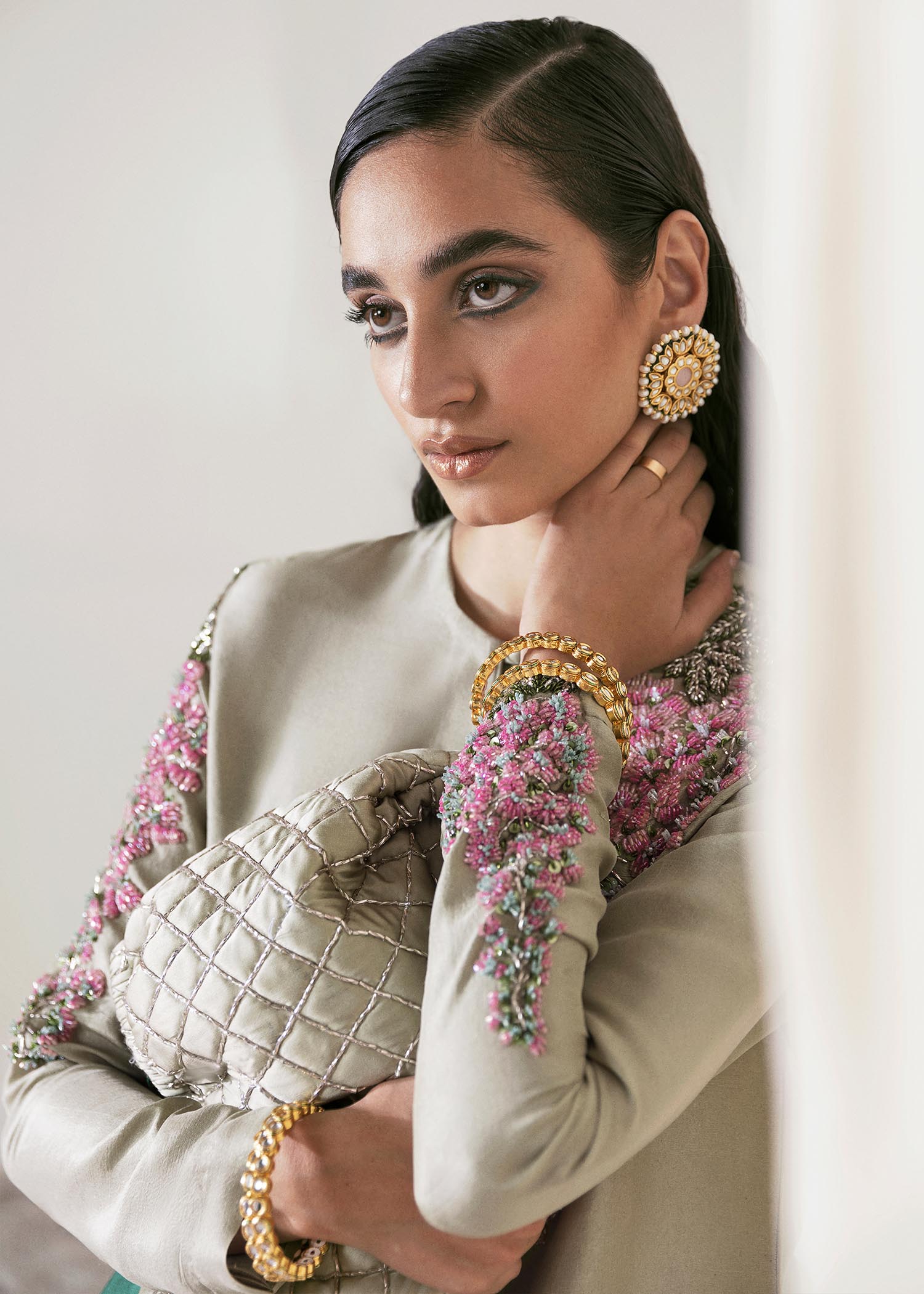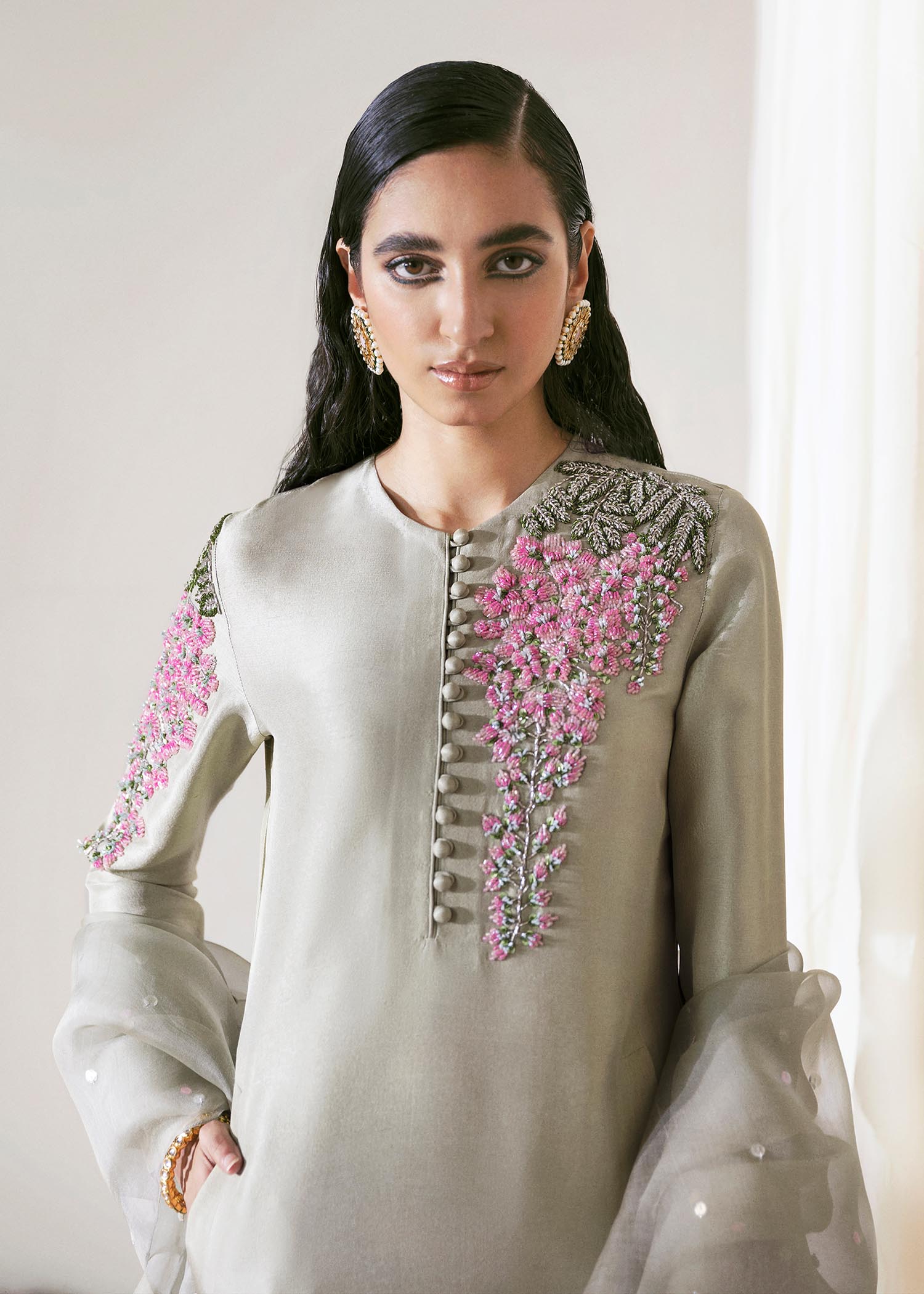 This pistachio green raw silk shirt is beautifully embellished with thick floral motifs adorned with pipes in shades of pink, green, silvers and hint of ice blue. While the interesting placement of embellishment makes the look more interesting. Paired with organza sprayed dupatta.