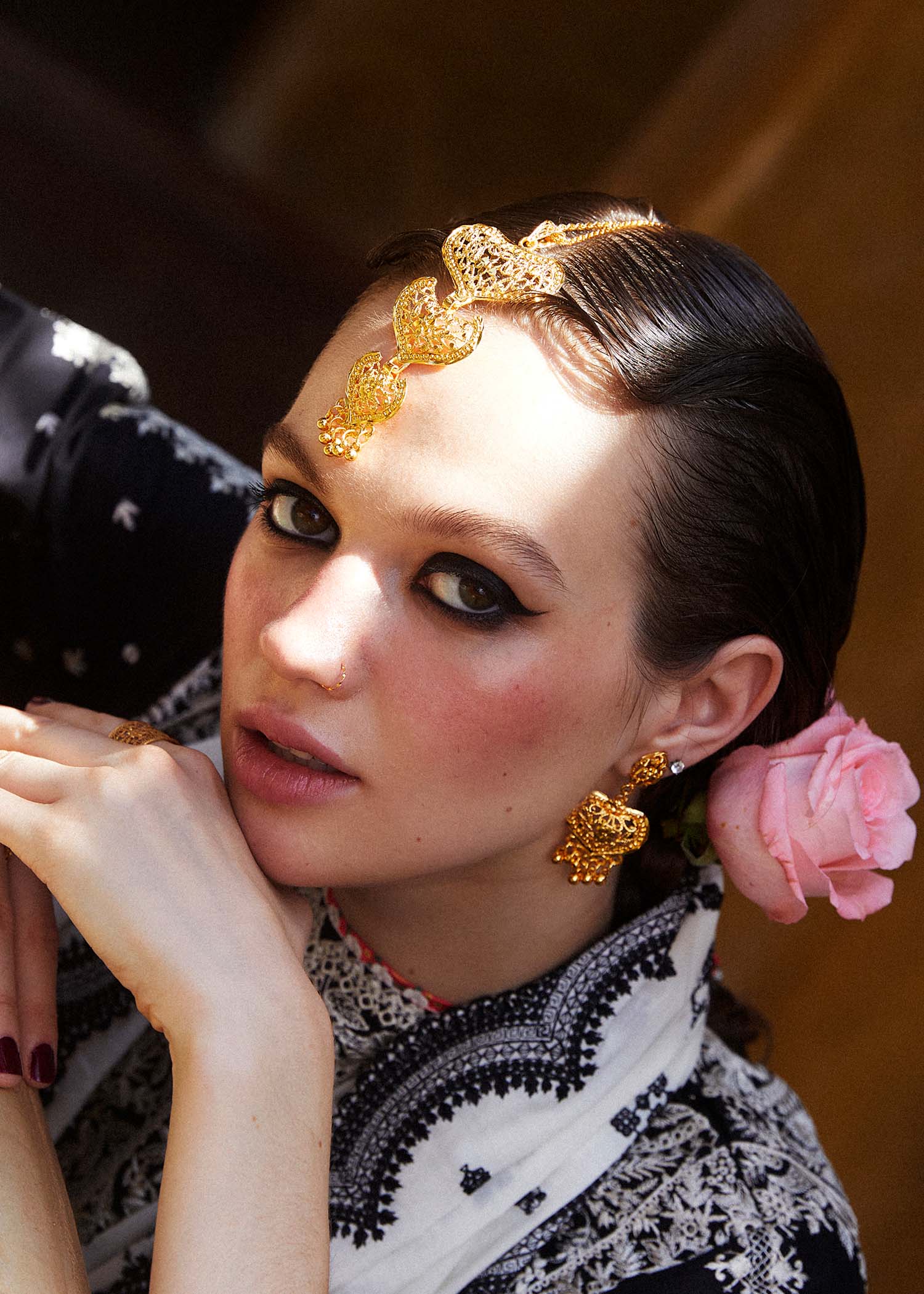 A classic contrast of black and ivory, where ethereal and symmetrical embroideries align together in stunning fashion fiesta. Curated finery that embraces beauty, elegance and timeless style. An alluring ivory allover embroidered lawn dupatta and an intricate modern embroidery on shalwar complementing this yin yang combo.