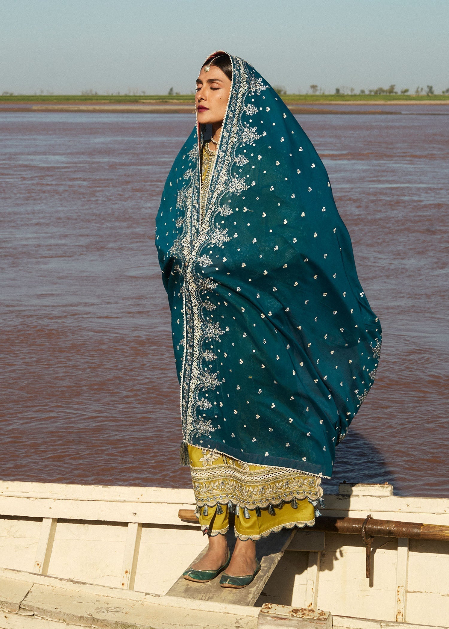 This is a beautifully embroidered lawn outfit with intricate silver embellishments on a vibrant olive-green base. The front-open style kameez features detailed floral and geometric embroidery, extending from the neckline to the hem. The sleeves are adorned with matching embroidery, adding to the elegance of the ensemble. The scalloped lace border with delicate tassels enhances its charm. Paired with the kameez is a solid matching trouser, completing the coordinated look. The contrast dupatta in a rich teal shade features dainty silver motifs and an intricately embroidered border, giving it a luxurious appeal. The addition of tassels on the dupatta adds a touch of sophistication, making this outfit a perfect choice for festive and semi-formal occasions.