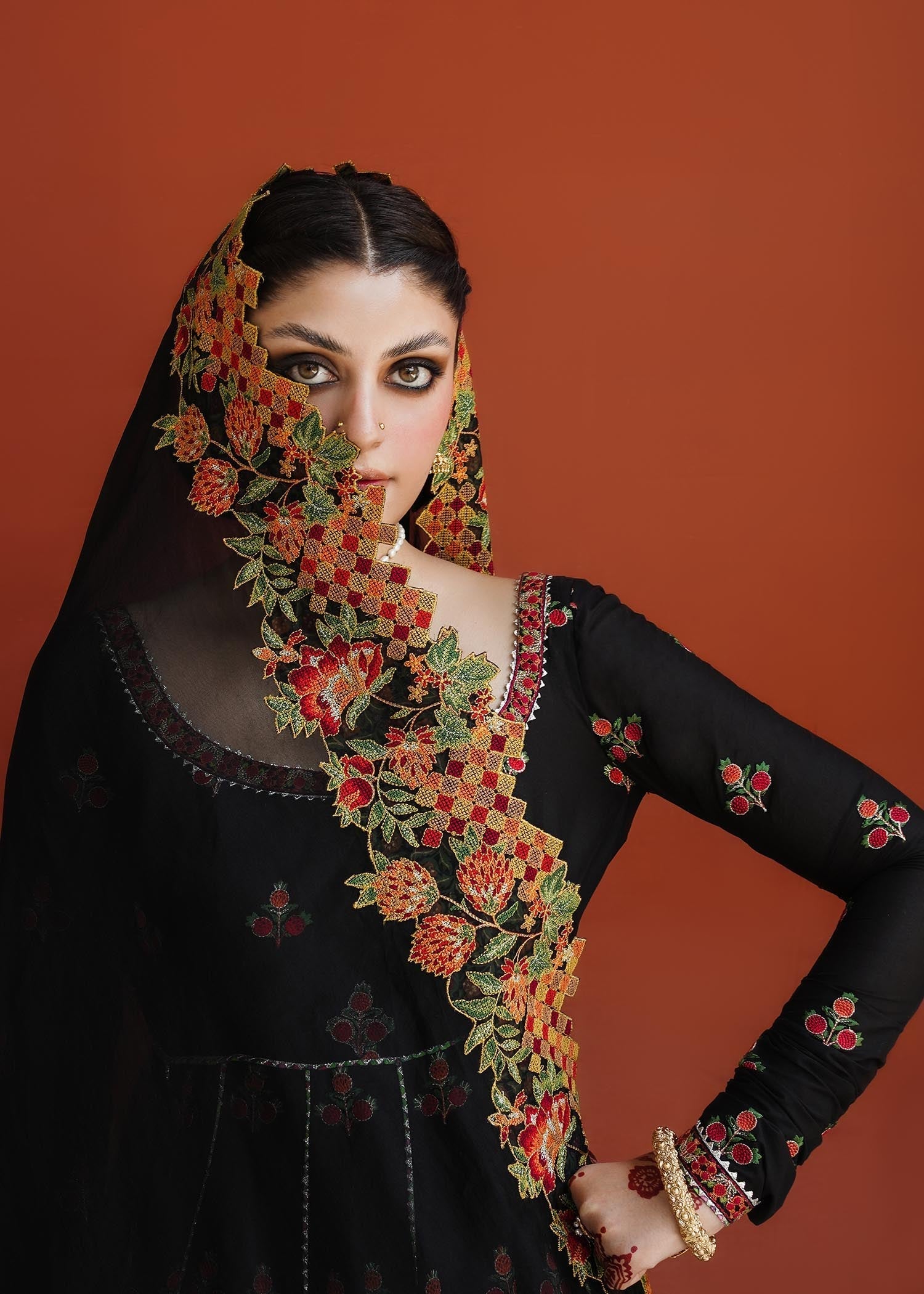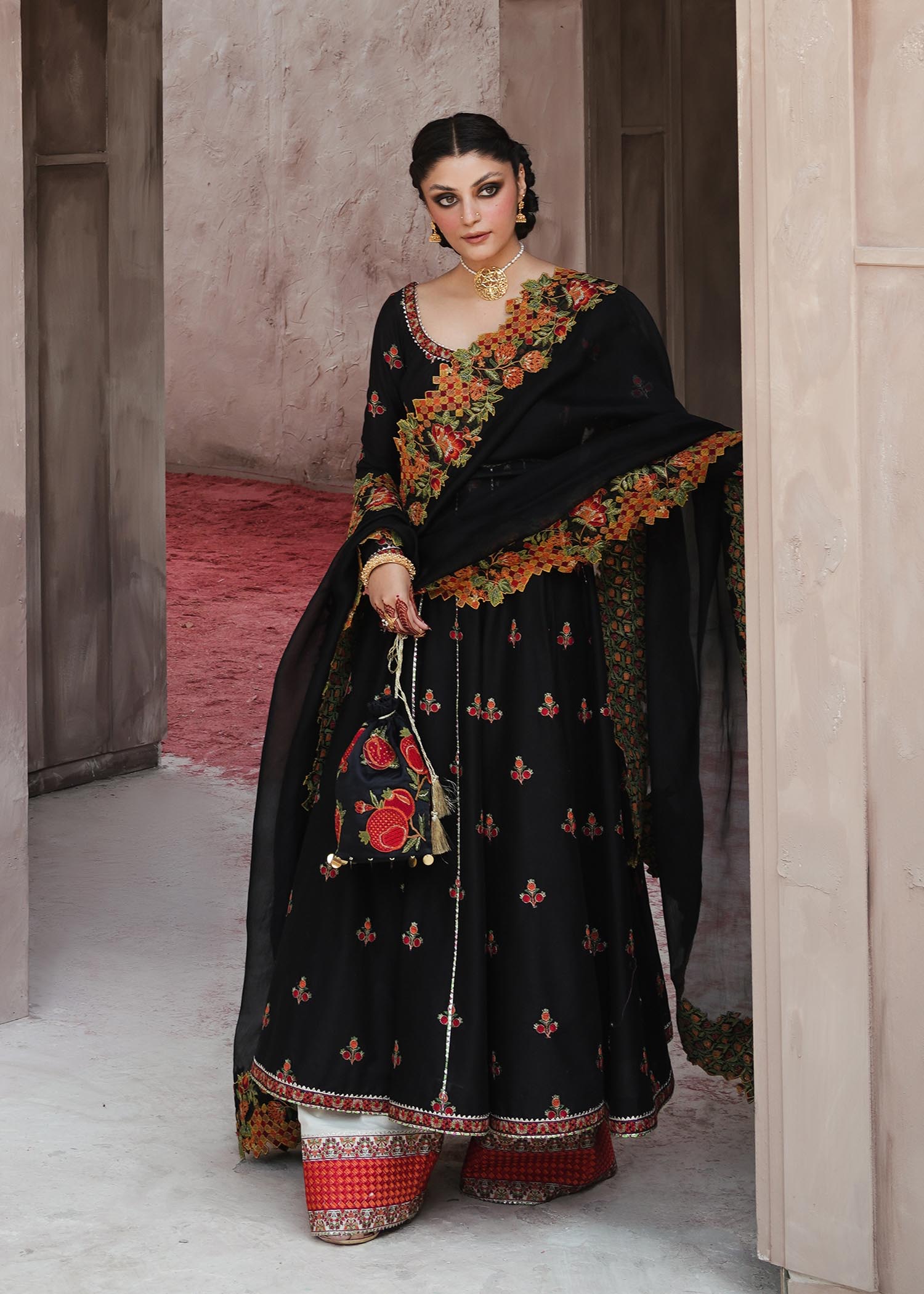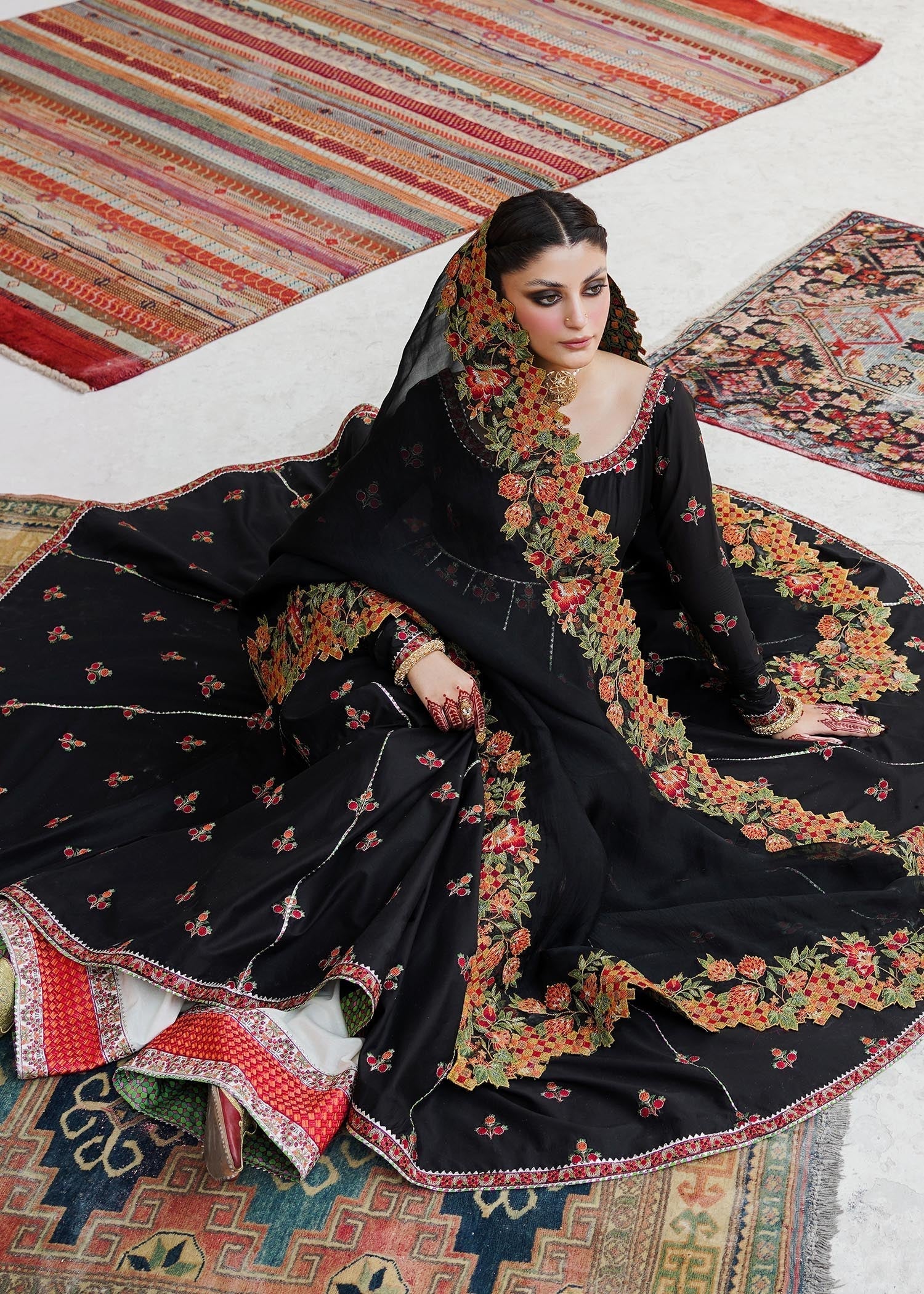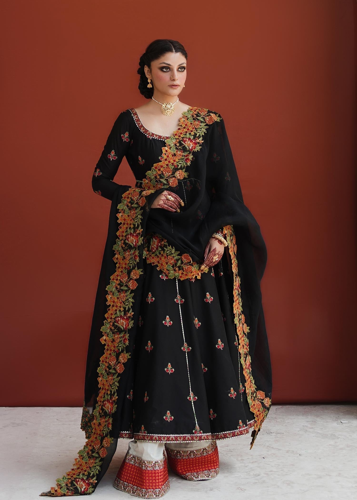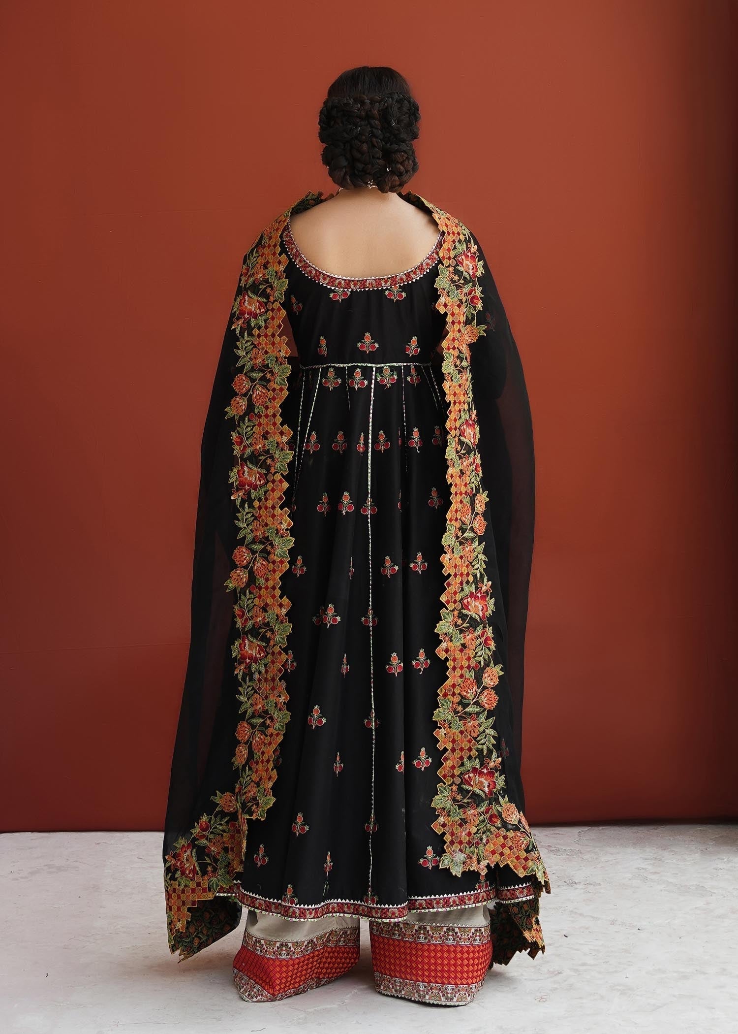 Siyaah Roop – this ensemble creates a picturesque view of rich tradition and class, infused with skillfully done embroidery on the finest fabric. An Anarkali frock with alluring floral motifs combined with pomegranate details and cross stitch embroidery detail organza dupatta that is paired with ivory color-blocking embroidered shalwar.