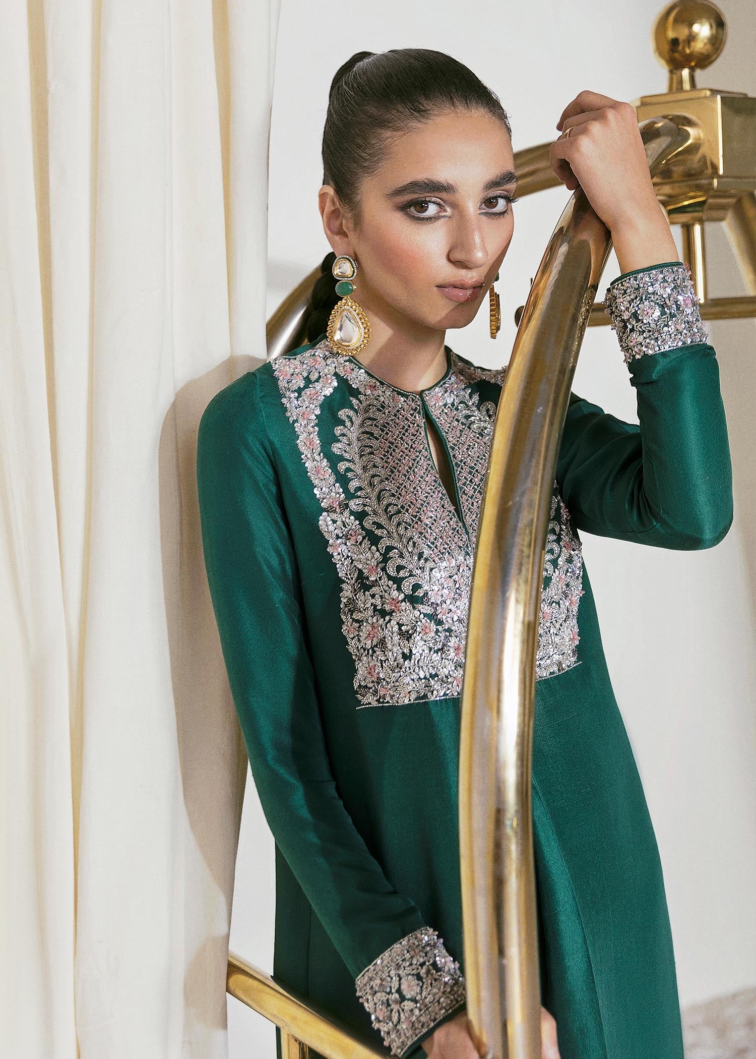 This elegant emerald green long shirt featuring box pleat is aesthetically decked with silver and pink jaal around the keyhole neckline, encrusted with pink sequin floral motifs. Completing the look with coordinating embellishments on sleeve opening. Dupatta or Pants can be added on customer demand, separately purchase.
