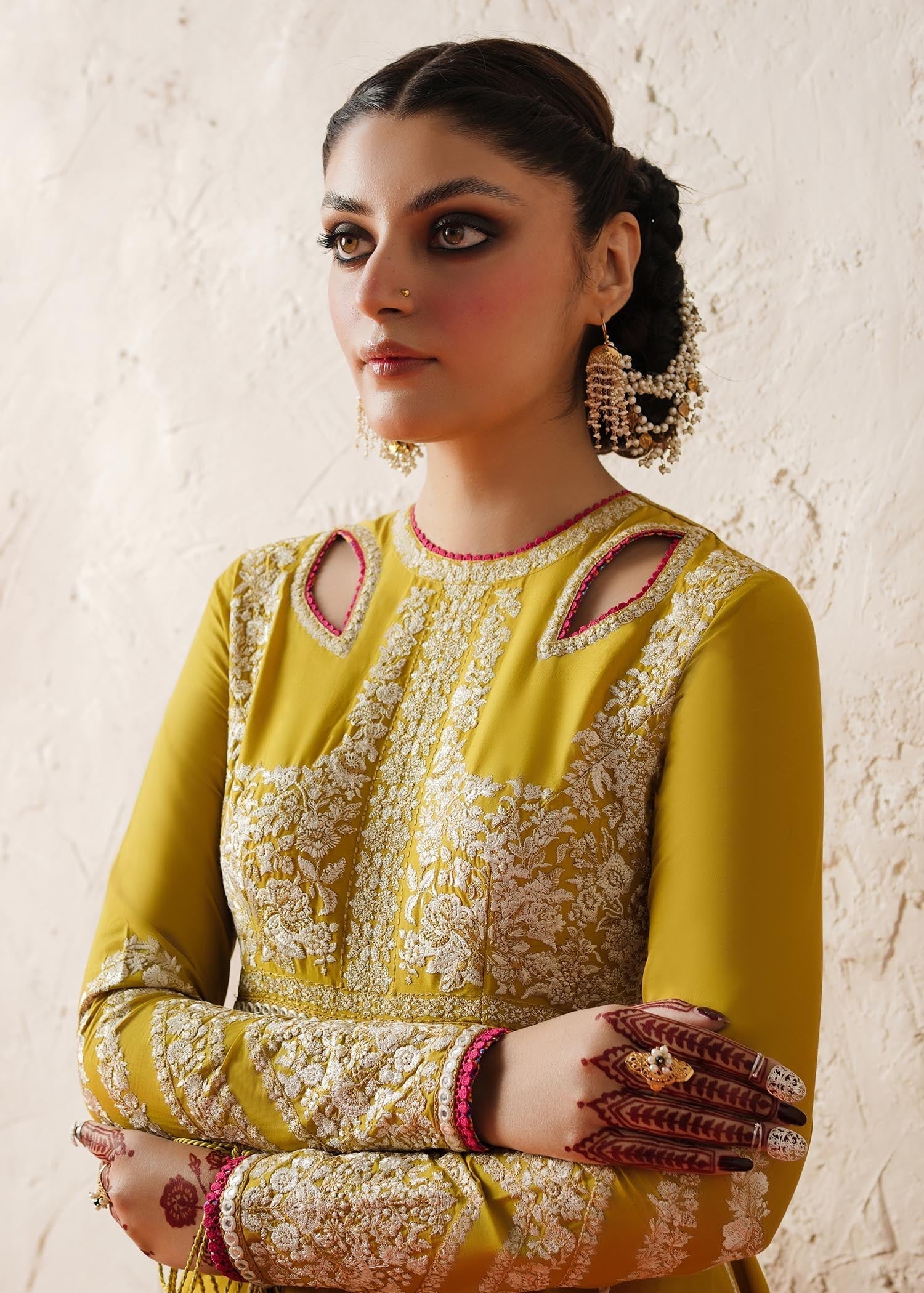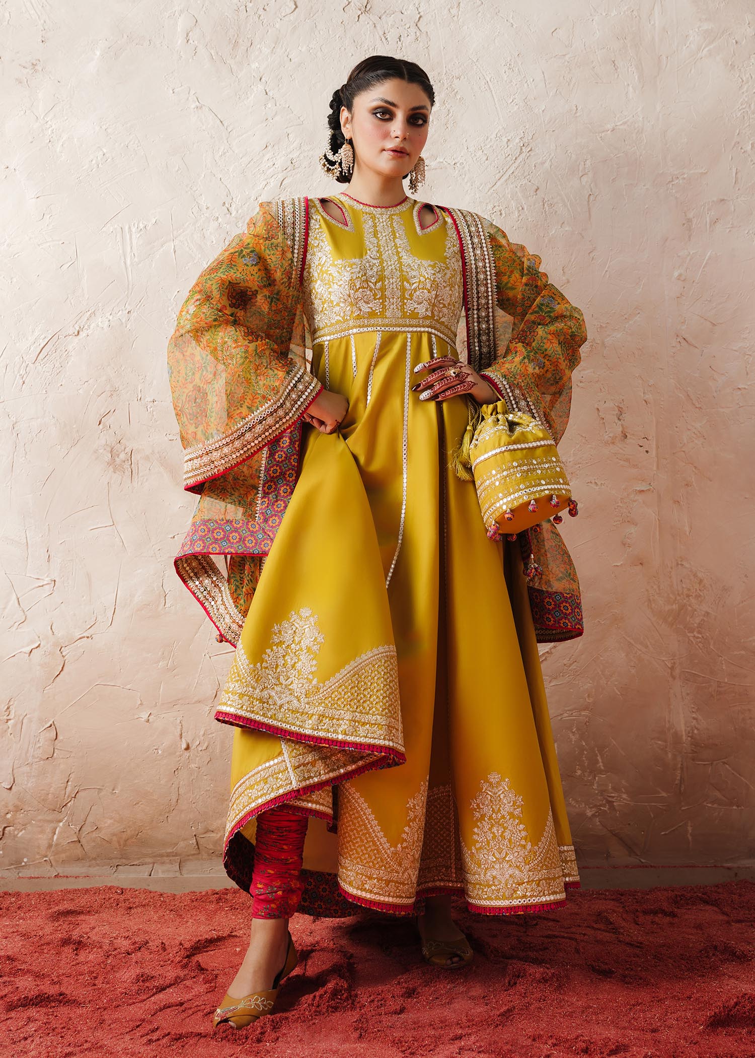 Beautiful vibrant marigold attire amalgamated with ivory traditional embroideries, adorned with panni is reminiscent of mughal sheesh mahal. An accent hot pink printed chooridar with mughal floral details and a printed organza dupatta with panni border enhanced with intricate detailing. This creates a perfect traditional eid look.