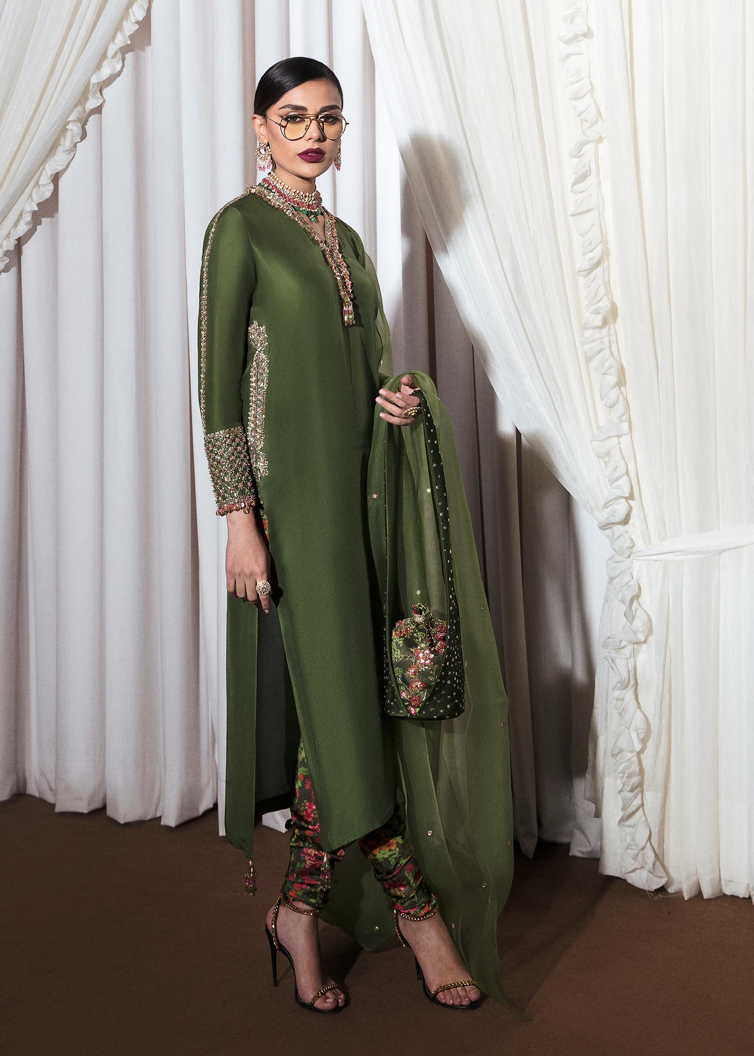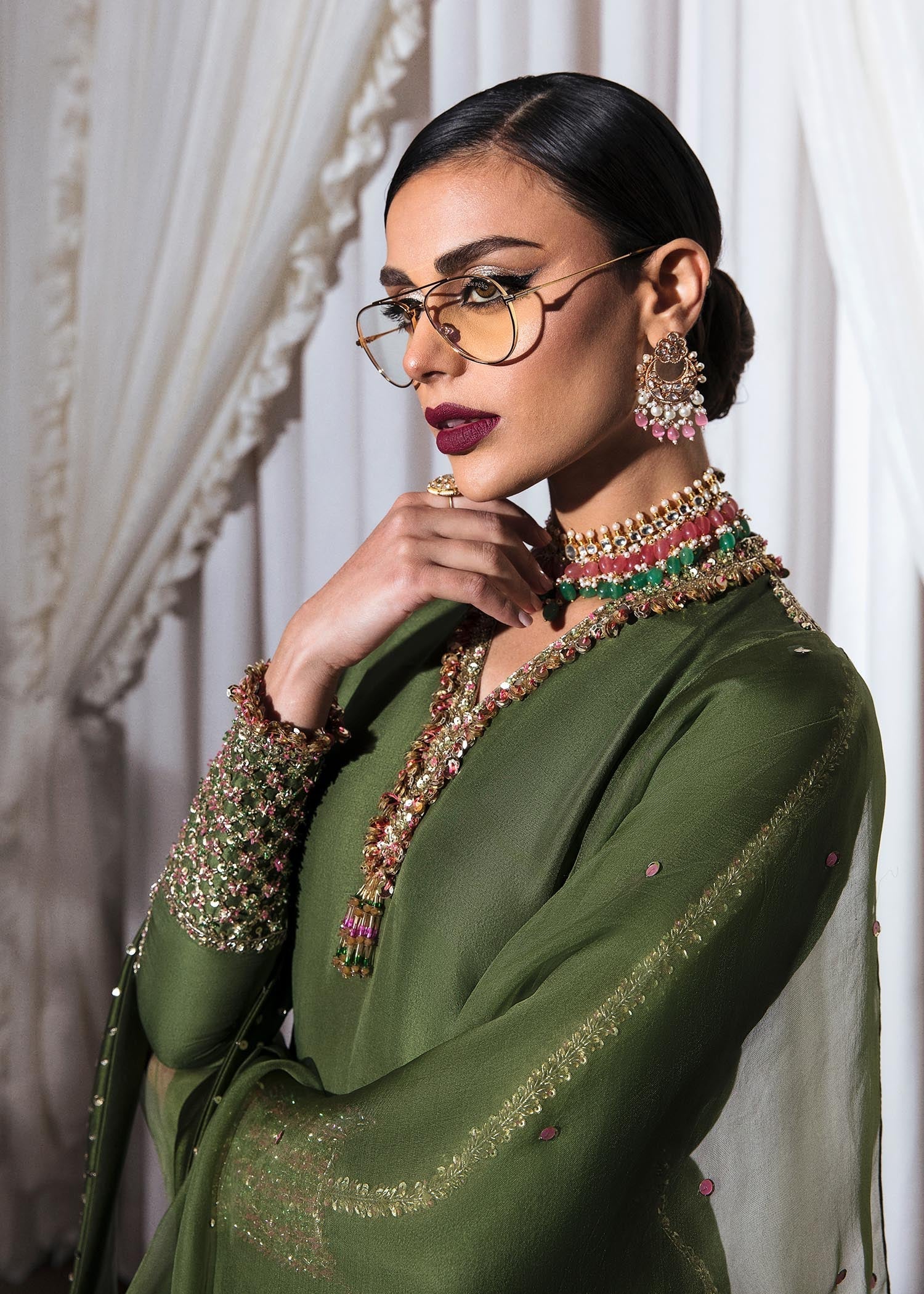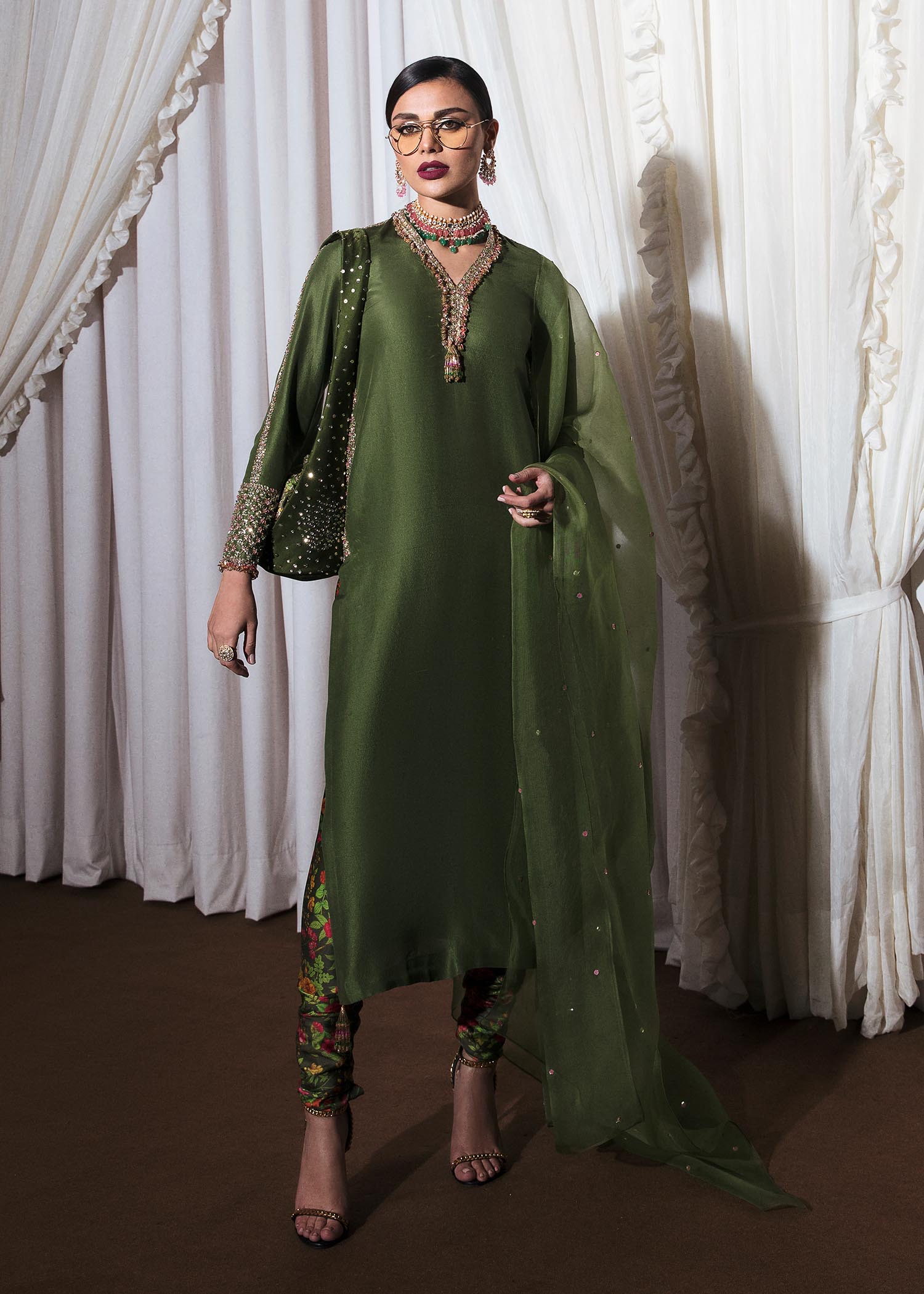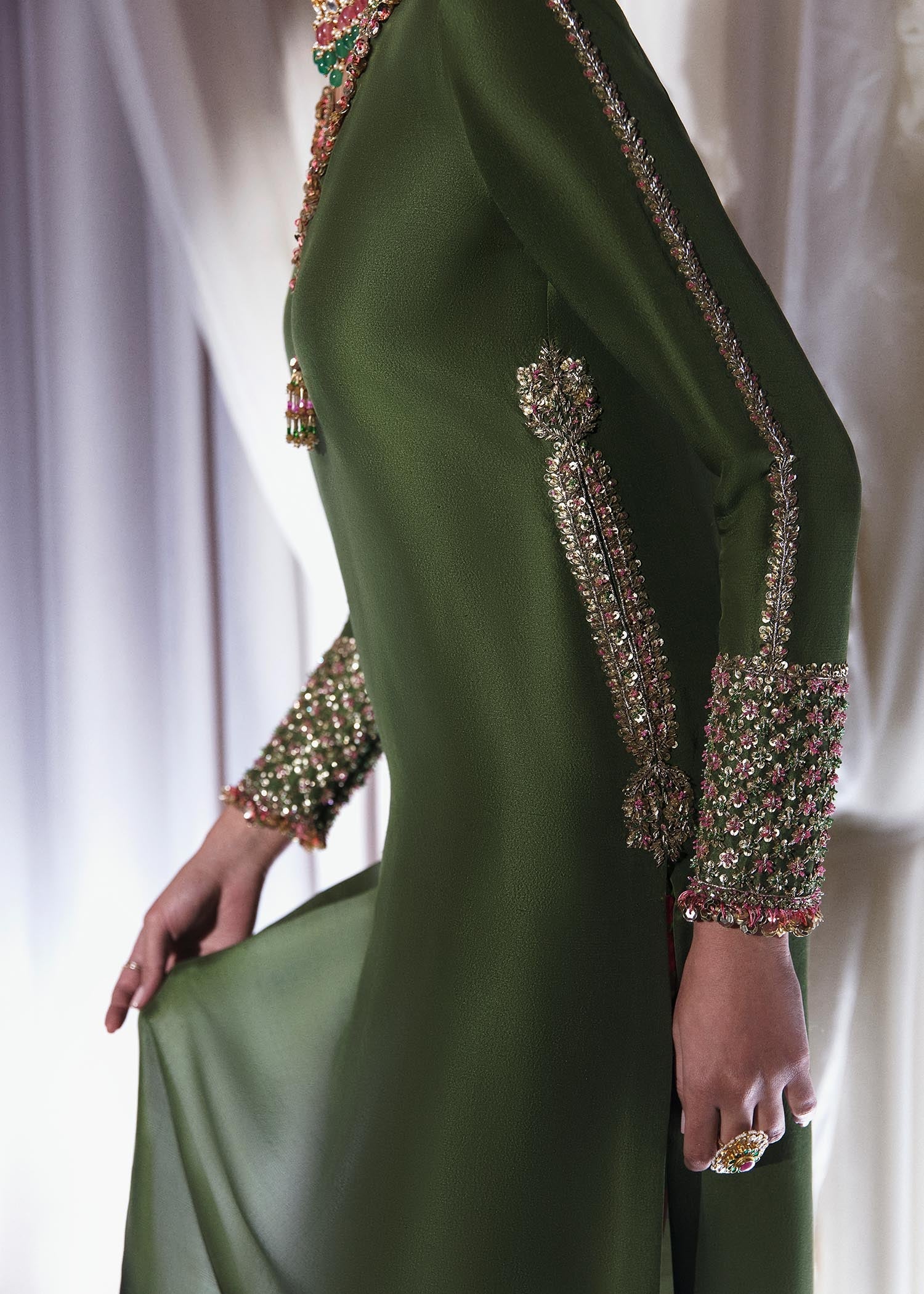 A fabulous green raw silk shirt with neckline and sleeves intricately embellished with gold sequins, pink green and golden buggle beads, gold nakshi, as well as orange, hot pink and light pink resham along with gold sequin for the tassle on the neckline.
